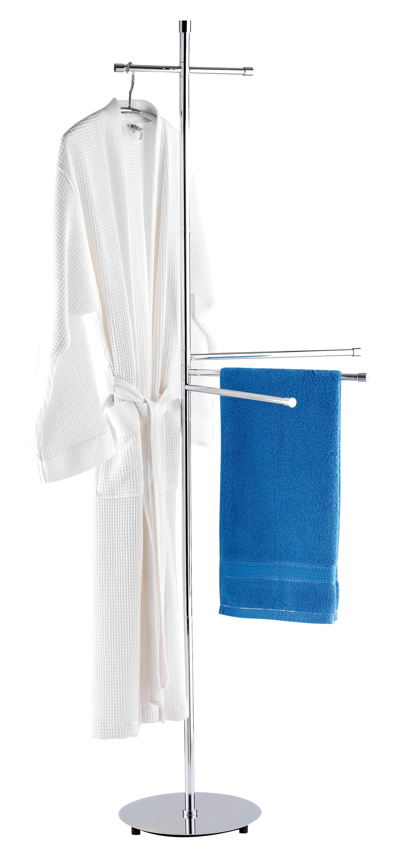 Jeho 3 pohyblivá ramena poskytují spoustu místa k zavěšení ručníků nebo oblečení. Na další závěsnou tyč můžete zavěsit také kabáty, šaty nebo župany. Kvalitní těžký stojan zajišťuje stabilitu volně stojícího stojanu.