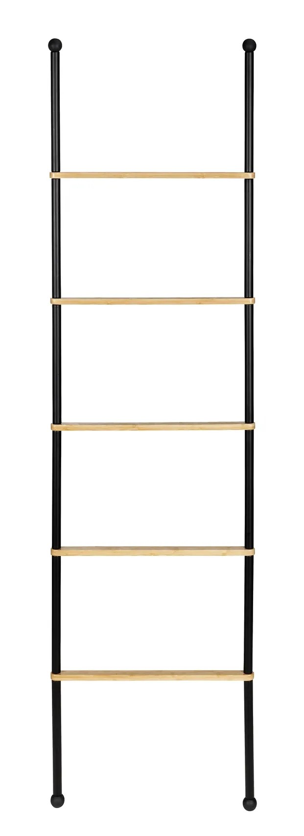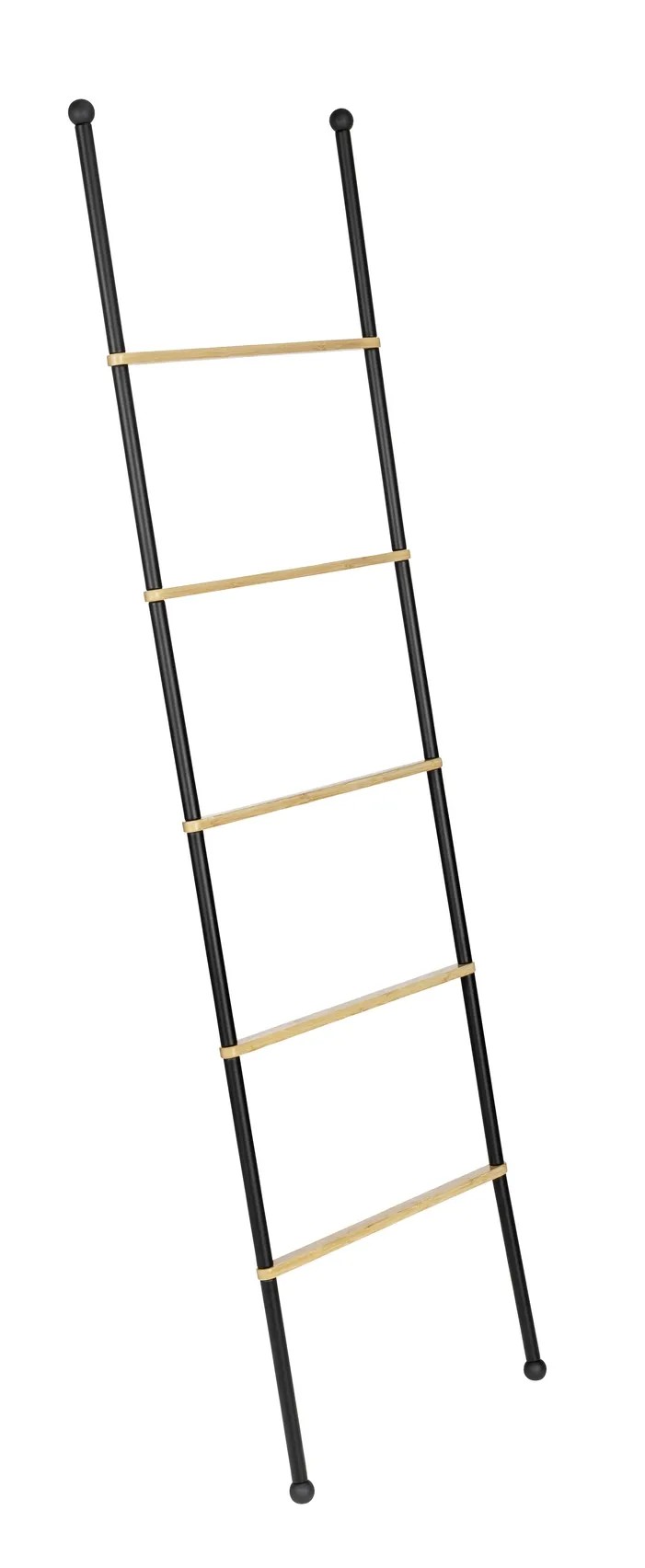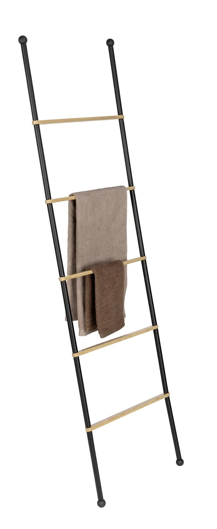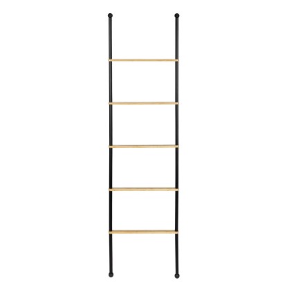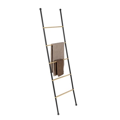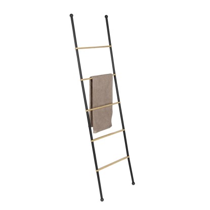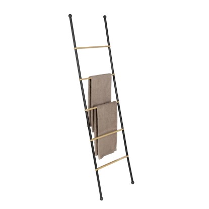 Žebřík Bambusa nabízí stylové místo pro uložení vašich ručníků. Má pět pevných příček mezi dvěma tyčemi z černě lakované oceli, abyste měli přehled a osušky i ručníky vždy na dosah. Protiskluzové nožičky zajišťují bezpečné umístění.