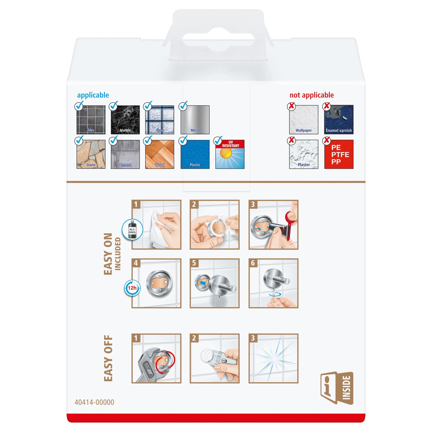 Předmět lze snadno a čistě připevnit na zeď bez vrtání nebo šroubování. Poté, co nasadíte montážní adaptér a naplníte jej lepidlem, které je součástí dodávky, počkejte 12 hodin a poté můžete položku bezpečně připevnit natrvalo. Přiložená upevňovací sada obsahuje upevňovací adaptér, lepidlo a imbusový klíč pro fixaci. Předmět je vhodný pro připevnění na dlaždice, kov, přírodní kámen, mramor, sklo, dřevo a mnoho plastů. I přes přídržnou sílu až 6 kg jej můžete kdykoli vyjmout a znovu použít s novým adaptérem (BK20).