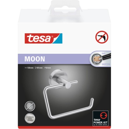 Snad nejdůležitějším koupelnovým doplňkem je toaletní papír. Ale funkčnost se klidně může pojit s krásou. Díky nerezovému povrchu, na kterém nezůstávají otisky prstů, je zaoblený držák toaletního papíru tesa Moon středem pozornosti vaší koupelny. Pro montáž není nutné žádné vrtání, protože držák místo toho používá lepení. Na obkladech ani stěnách nebude žádné poškození.