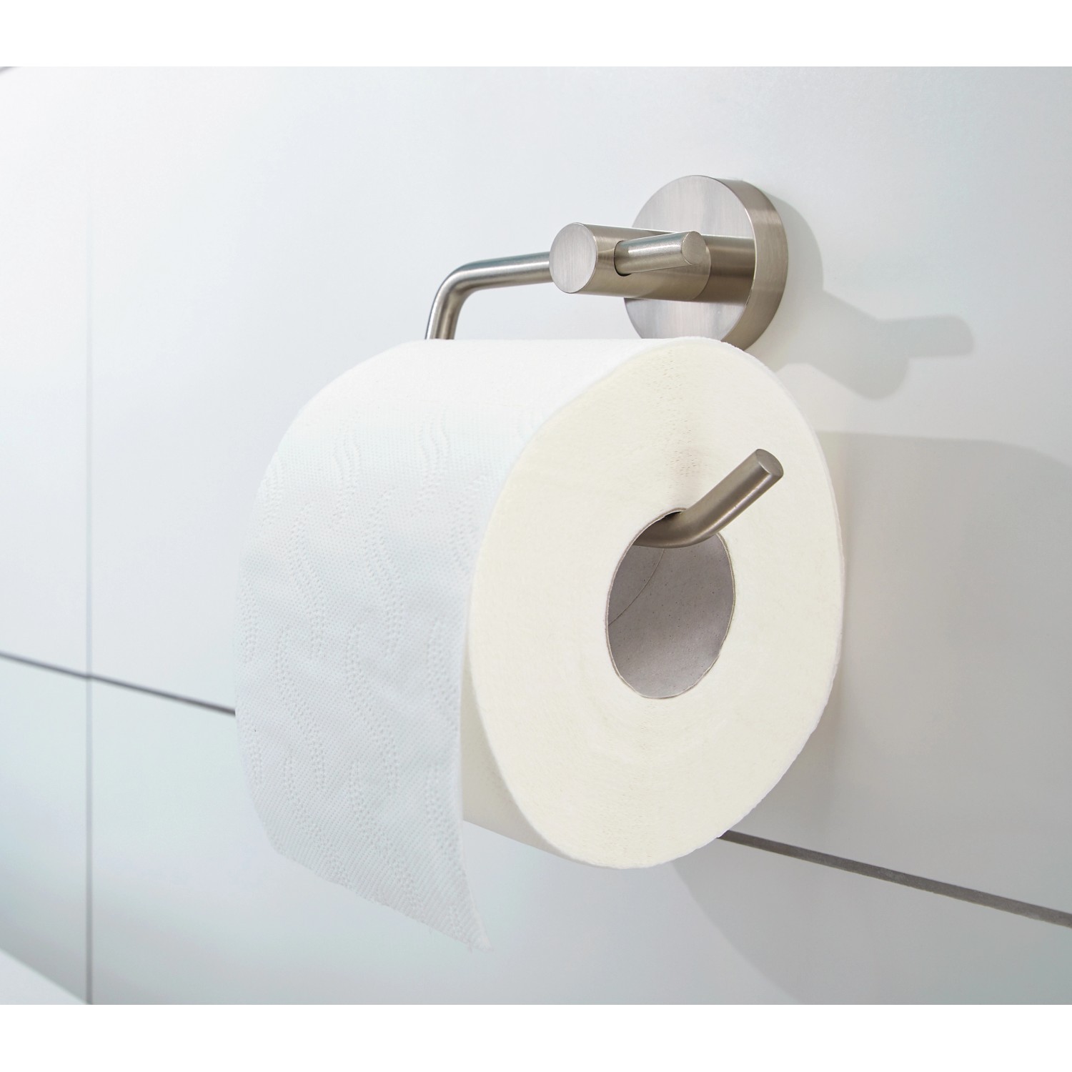 Montáž samolepicího držáku toaletního papíru tesa Moon na stěnu je dětsky jednoduchá. Jeho lesklý, zaoblený design je nádherný.