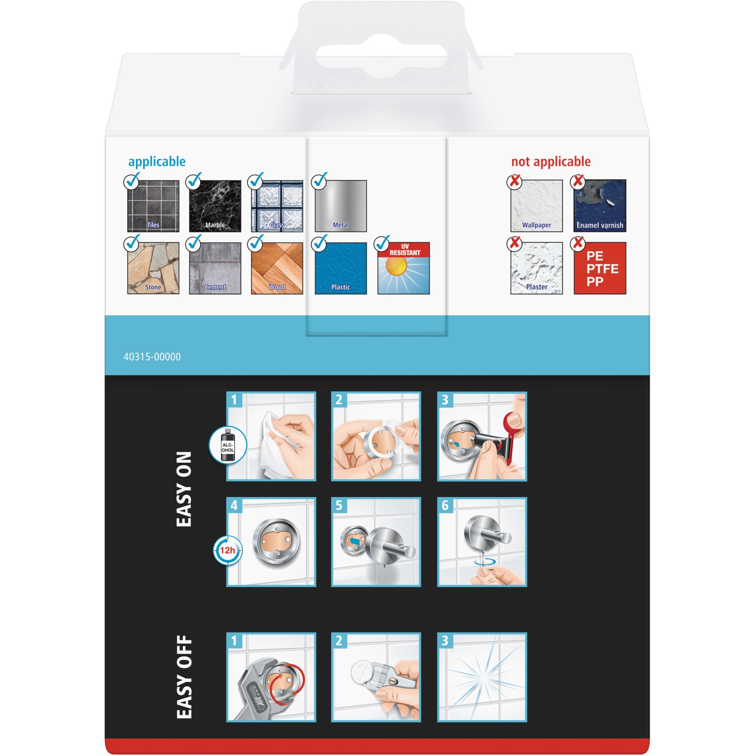 Je připevněn lepicím řešením, které funguje pro většinu povrchů a vrtání přitom odpadá. Proto na obkladech ani stěnách nebude žádné poškození. Lepidlo zasychá za 12 hodin, čímž je dosaženo maximální pevnosti. Demontáž držáku a lepidlo nezanechávají žádné stopy a držák lze s novým adaptérem BK20 velice snadno připevnit jinde.