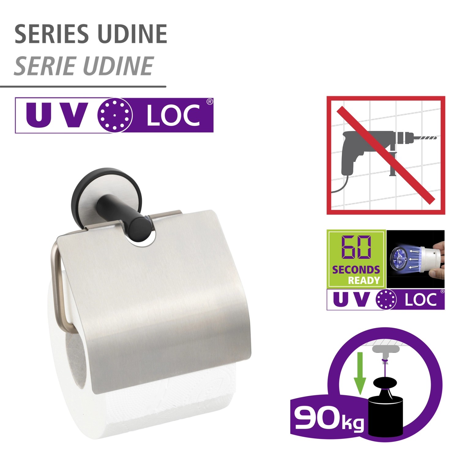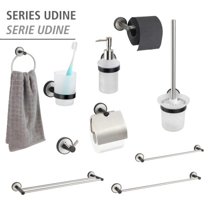 Doplňky koupelnové série Udine promění koupelnu v čisté místo, ve kterém se budete cítit příjemně. Příslušenství z nerezové oceli v kombinaci kartáčovaného vzhledu a matně černého laku se skvěle začlení do koupelen zařízených v moderním a urbanistickém stylu. Doplňky lze upevnit pomocí přiloženého systému UV-Loc. Pro standardní upevnění jsou součástí dodávky šrouby a hmoždinky.