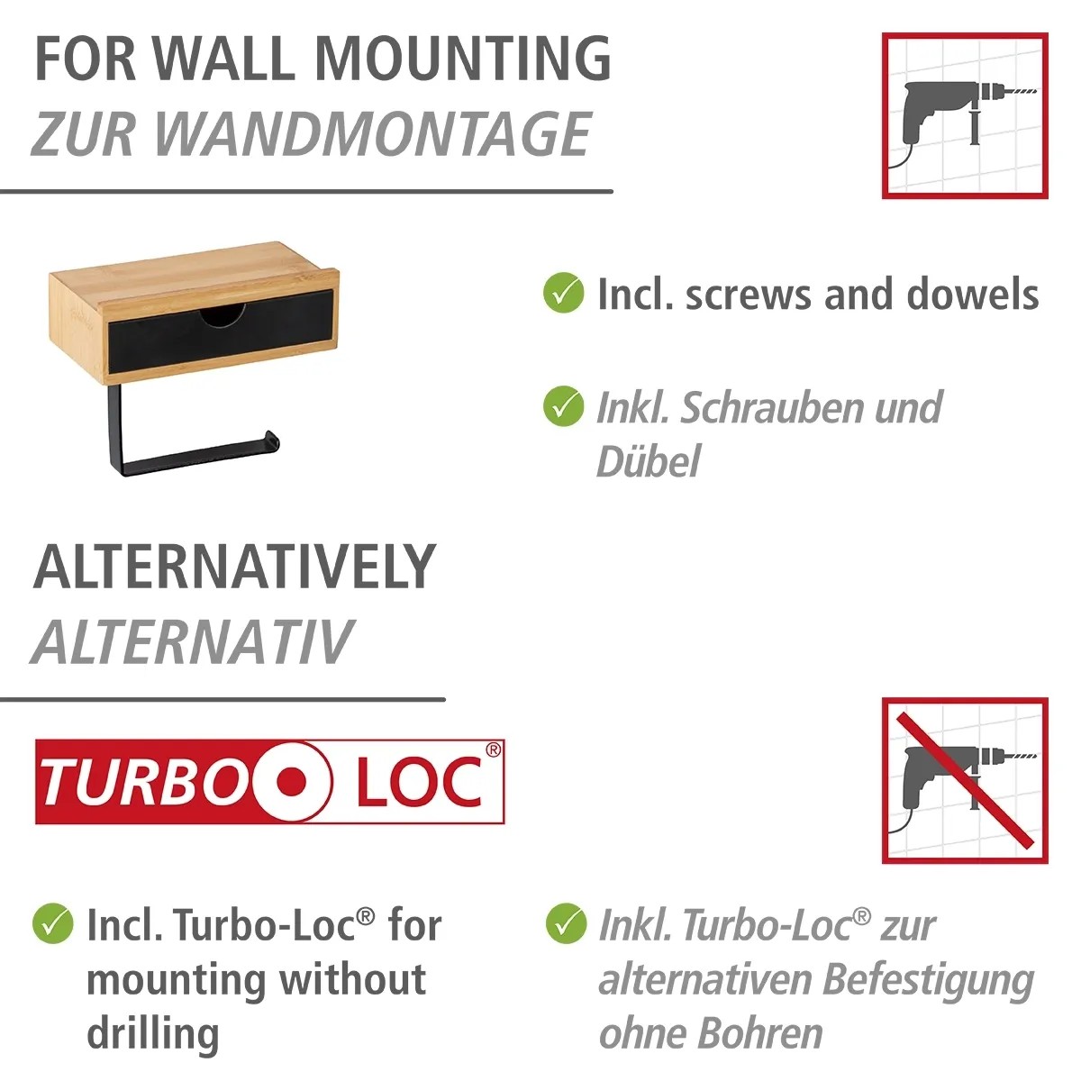 Držák toaletního papíru s úložným prostorem a zásuvkou zajistí, že role toaletního papíru bude vždy úhledně připravena. Zásuvka poskytuje prostor pro balení vlhčeného toaletního papíru, krém na ruce či hygienické potřeby. Na poličku si můžete odložit mobilní telefon, nebo ji využít pro umístění dekorací.
