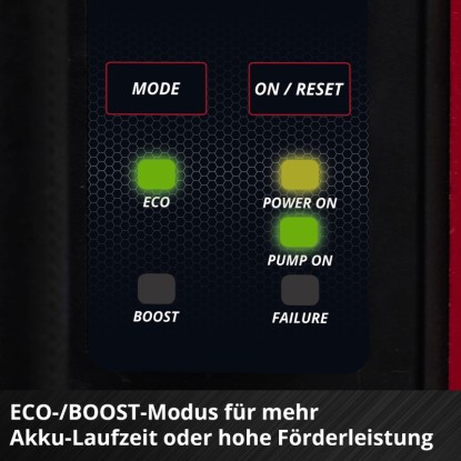 Automatické zahradní čerpadlo je vybaveno dvěma režimy výkonu: Režim BOOST pro maximální čerpací výkon a režim ECO pro maximální dobu provozu na baterie při nižším čerpacím tlaku. Akumulátorové čerpadlo dokáže přečerpat až 3 800 litrů vody za hodinu. Může dosáhnout maximální výtlačné výšky 37 metrů, což odpovídá maximálnímu výtlačnému tlaku 3,7 baru. Vodu lze nasávat z hloubky až 6 metrů.