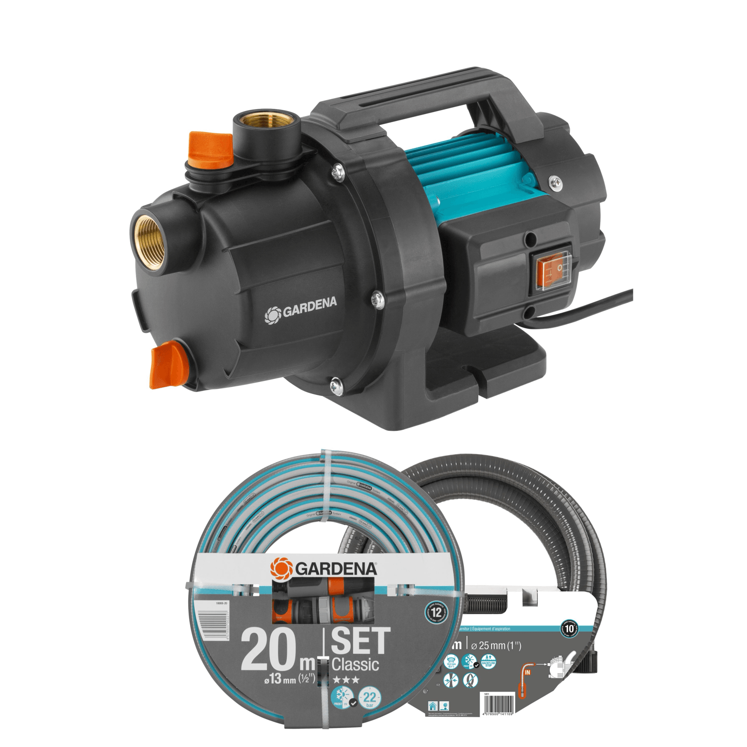 Sada obsahuje vše, co potřebujete k rychlému připojení a uvedení vašeho elektrického čerpadla do provozu. Kompletní řešení zahrnuje klasické zahradní čerpadlo GARDENA 3000/4 BASIC, 3,5 m dlouhou sací hadici a originální zahradní hadici GARDENA o délce 20 m, včetně postřikovače a konektorů.