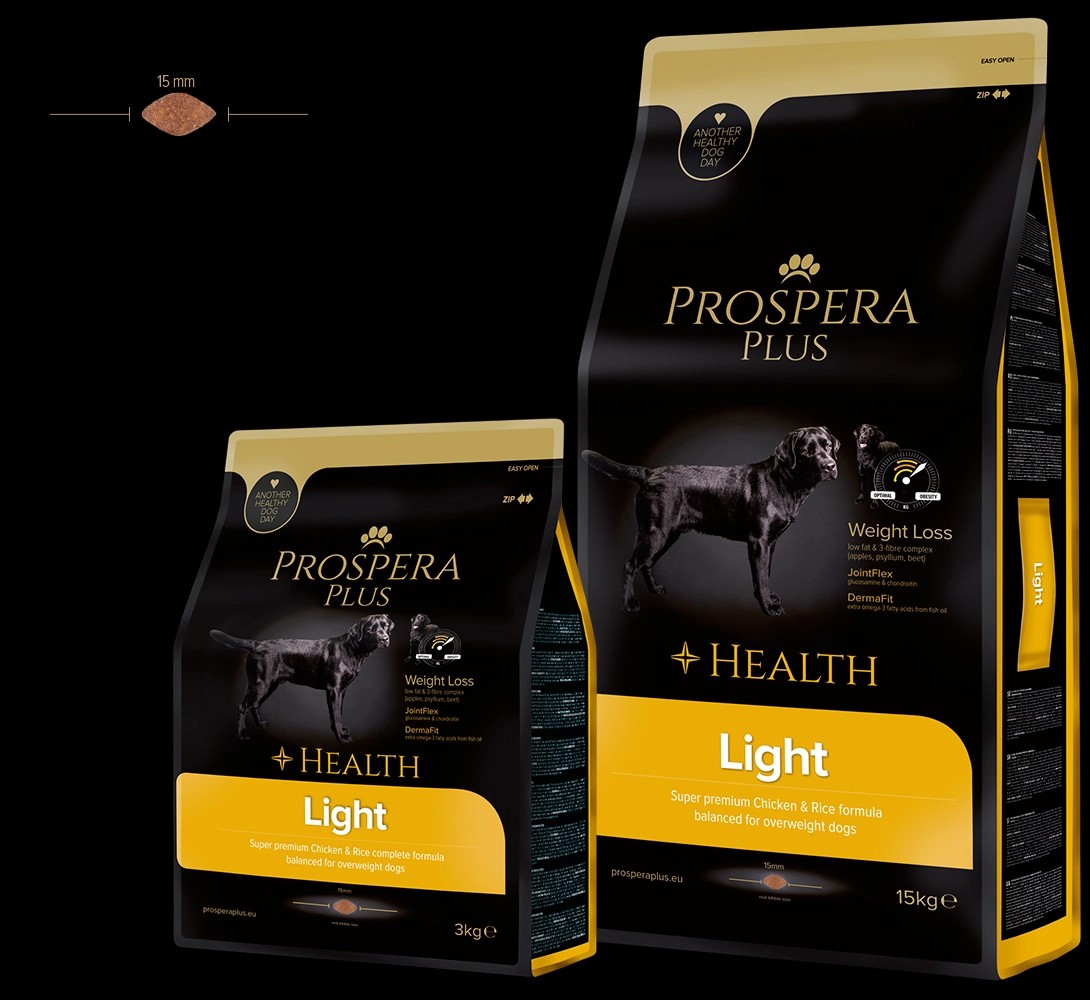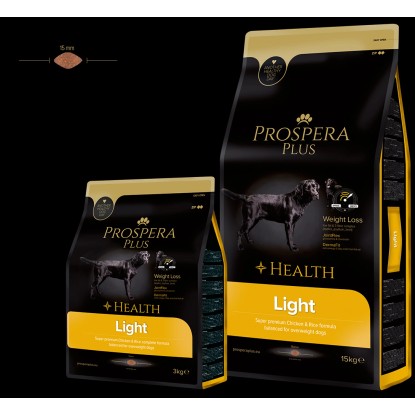 PROSPERA PLUS Light je superpremiové krmivo, s recepturou vhodnou pro dospělé psy trpící nadváhou nebo psy s menší aktivitou. Základem receptury je kvalitní lehce stravitelné kuřecí maso s nízkým obsahem tuku. Dalšími důležitými složkami krmiva je komplex 3 vláknin (jablečné, řepné a z jitrocele), které napomáhají správné regulaci váhy psů. Krmivo je obohaceno o rybí tuk (omega 3 mastné kyseliny), který zlepšuje zdravou srst a kůži. Chondroprotektiva glukosamin a chondroitin pomáhají posilovat a stabilizovat kosti a klouby.