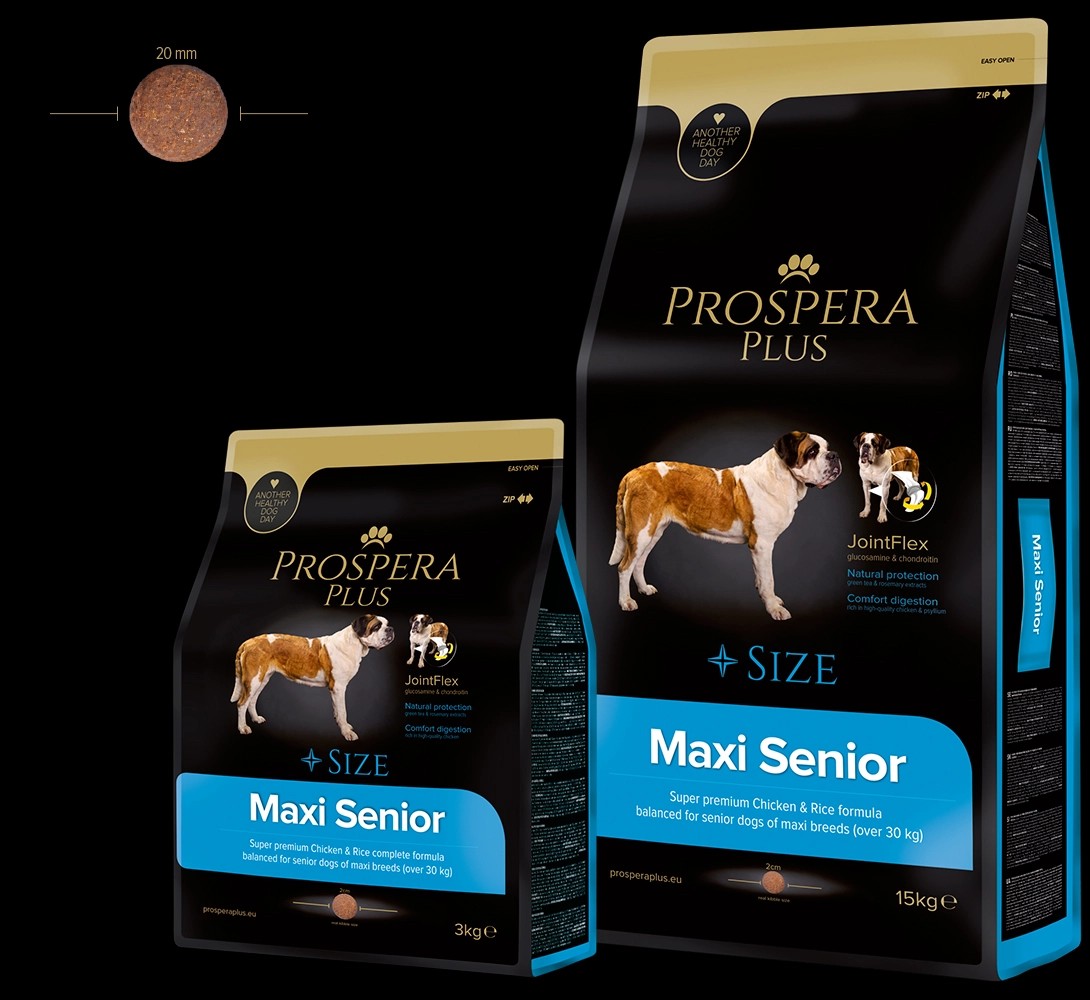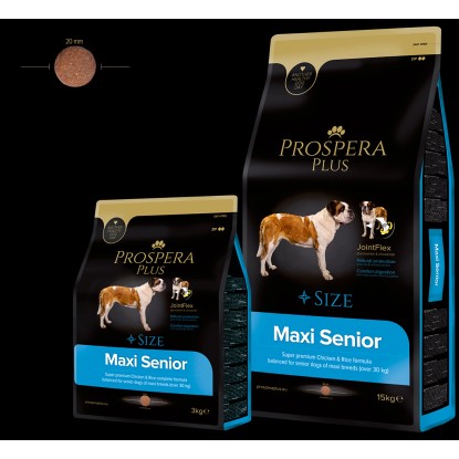 PROSPERA PLUS Maxi Senior je superpremiové krmivo, které je přizpůsobeno tak aby splňovalo měnící se nutriční a fyziologické požadavky starších psů velkých a obřích plemen. Chondroprotektiva glukosamin a chondroitin pomáhají posilovat a stabilizovat kosti a klouby. Krmivo je bohaté na vysoce kvalitní a lehce stravitelné kuřecí maso obohacená o psyllium, které podporuje správný metabolismus tuků a pomáhá udržovat správnou hladinu cholesterolu. Ingredience obsažené v receptuře, fruktooligosacharidy a extrakt z kvasnic, posilují imunitu vašeho psa. Přírodní Omega 3 mastné kyseliny z rybího tuku společně s pupalkovým olejem zase přispívají ke zdravé srsti a krásné kůži.