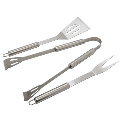 Sada nářadí pro grilování, skládající se z obracečky, vidličky a kleští. Kleště jsou speciálně tvarovány pro jistý úchop nejrůznějších pokrmů a mají délku 35 cm. Dvouzubá vidlička s délkou 32 cm. Obracečka délky 33 cm s precizně zabroušenou hranou, a odtokovými otvory pro otáčení masitých ale i jiných pokrmů. Jednotlivé nářadí je kvalitně zhotoveno z nerezové oceli, není nijak zbytečně tvarováno, což významně usnadňuje čištění. Rukojeti jednotlivých nástrojů jsou kruhového průřezu a výborně padnou do ruky. Všechny nástroje lze navíc zavěsit za háček.