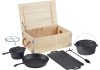 Sada vč. dřevěné bedny zahrnuje: 1 hrnec, 1 pánev, 1 hrnec na omáčku, 1 grilovací desku, 1 zvedák víka a 1 železný podstavec pro větší vzdálenost k ohni (cca 5 cm). Povrch je předošetřen speciálním rostlinným olejem, aby bylo zabráněno korozi.