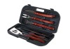 Nerezová sada s dřevěnou rukojetí v plastovém kufříku obsahuje: čistící drátěný kartáč 48 cm, grilovací zubaté kleště 45 cm, obracečka 48 cm, porcovací nůž s čepelí o délce 45 cm, vidlička se 2 hroty o délce 46 cm.