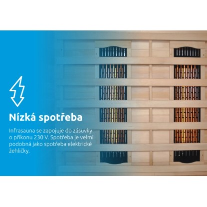 - Infrasauna se zapojuje do zásuvky o příkonu 230 V. Spotřeba je velmi podobná jako spotřeba elektrické žehličky.