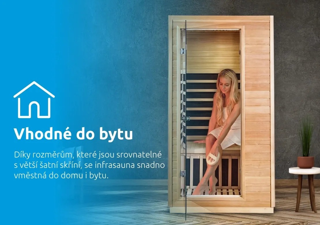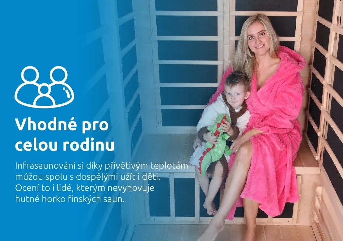 - Pocení a detoxikace probíhá již při 45-50 °C. Díky tomu je proces infrasaunování přístupnější a vhodný i pro děti.