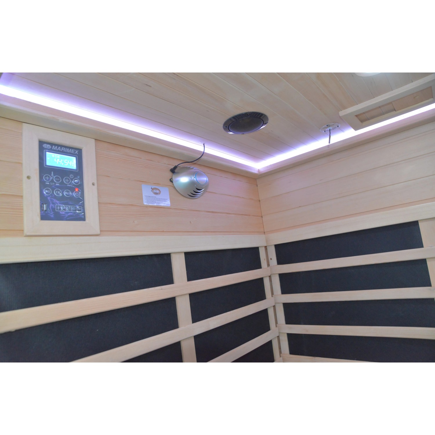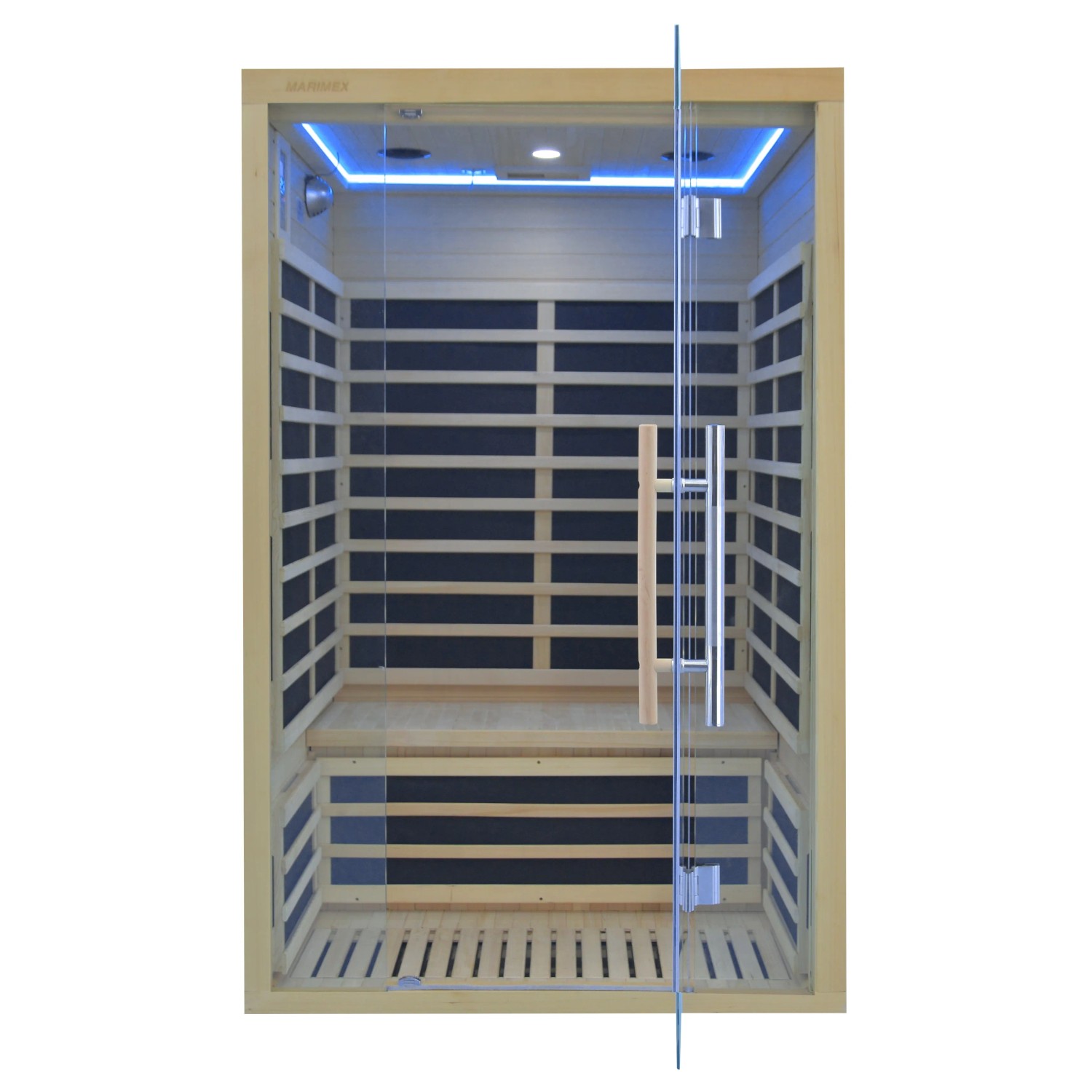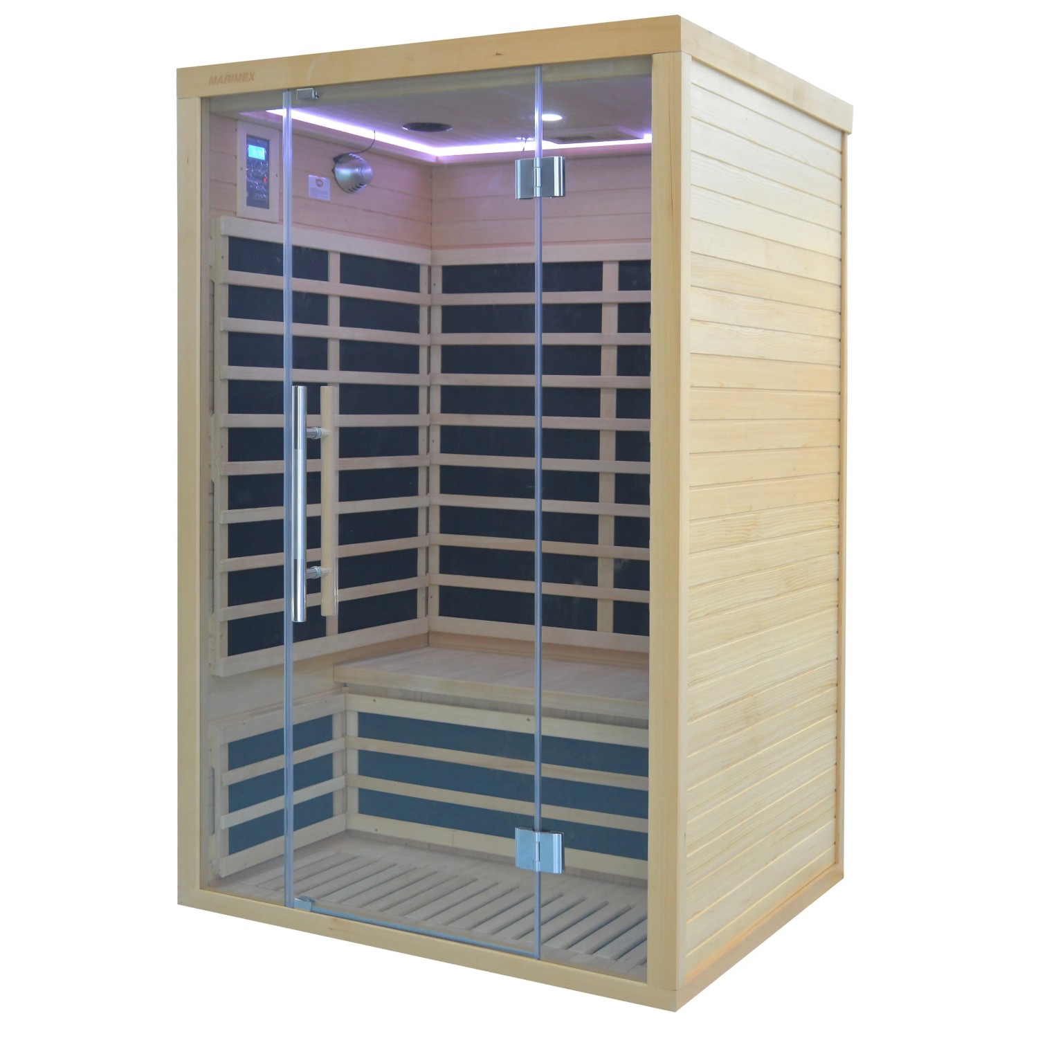 Infrasauna Marimex TRENDY 2001 L se díky svému designu hodí do každého interiéru. Při výrobě bylo použito kvalitního dřeva kanadského jedlovce - hemlocku. Infrasauna Marimex Trendy 2001 L umožňuje vychutnat kouzlo saunování až dvěma osobám. Malé rozměry dovolují infrasaunu umístit v rodinném domě i prostornějším bytě. Skleněné dveře umožňují pohodlný výhled po okolí sauny. Součástí výbavy je ionizér a rádio/mp3 přehrávač. Tato infrasauna obsahuje karbonové podlahové topidlo. Hloubka lavice v infrasauně je 45 cm.