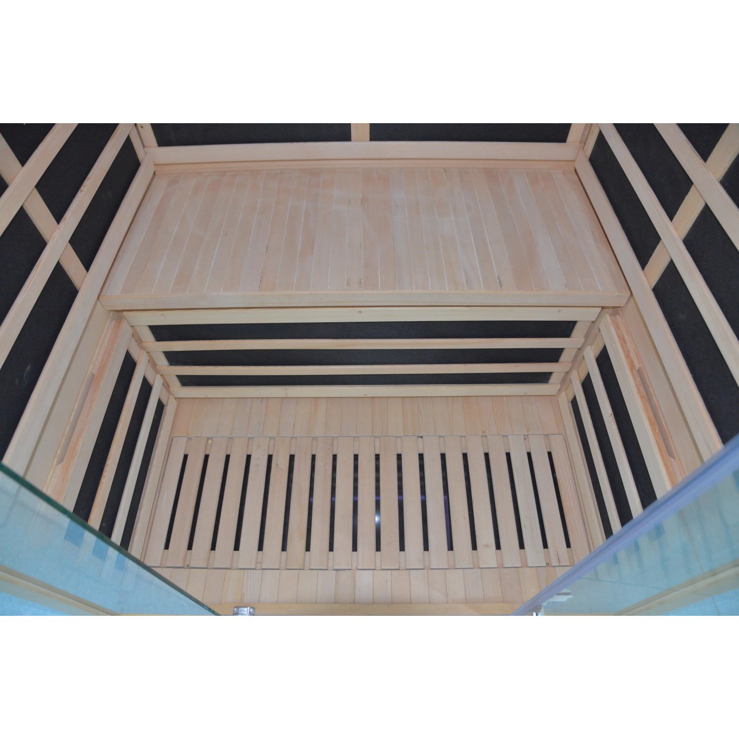V infrasauně je rozmístěno deset karbonových topidel. Ve srovnání s jinými typy karbonové zářiče tvoří tenké pásy, které vyvinou povrchovou teplotu 70-170 °C. Karbonové zářiče dosáhnou maximální teploty pomaleji, naproti tomu mají delší životnost (při saunování 3x týdně cca 90 let). Tento typ zářičů prohřeje lidské tělo rovnoměrně a do hloubky.