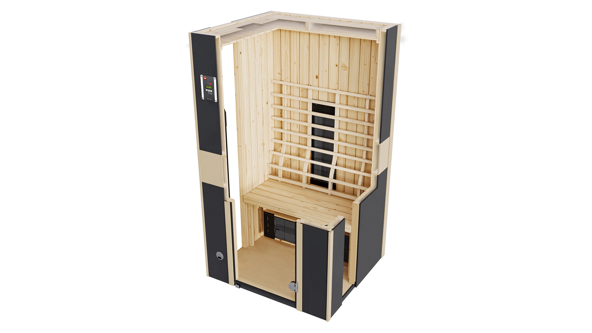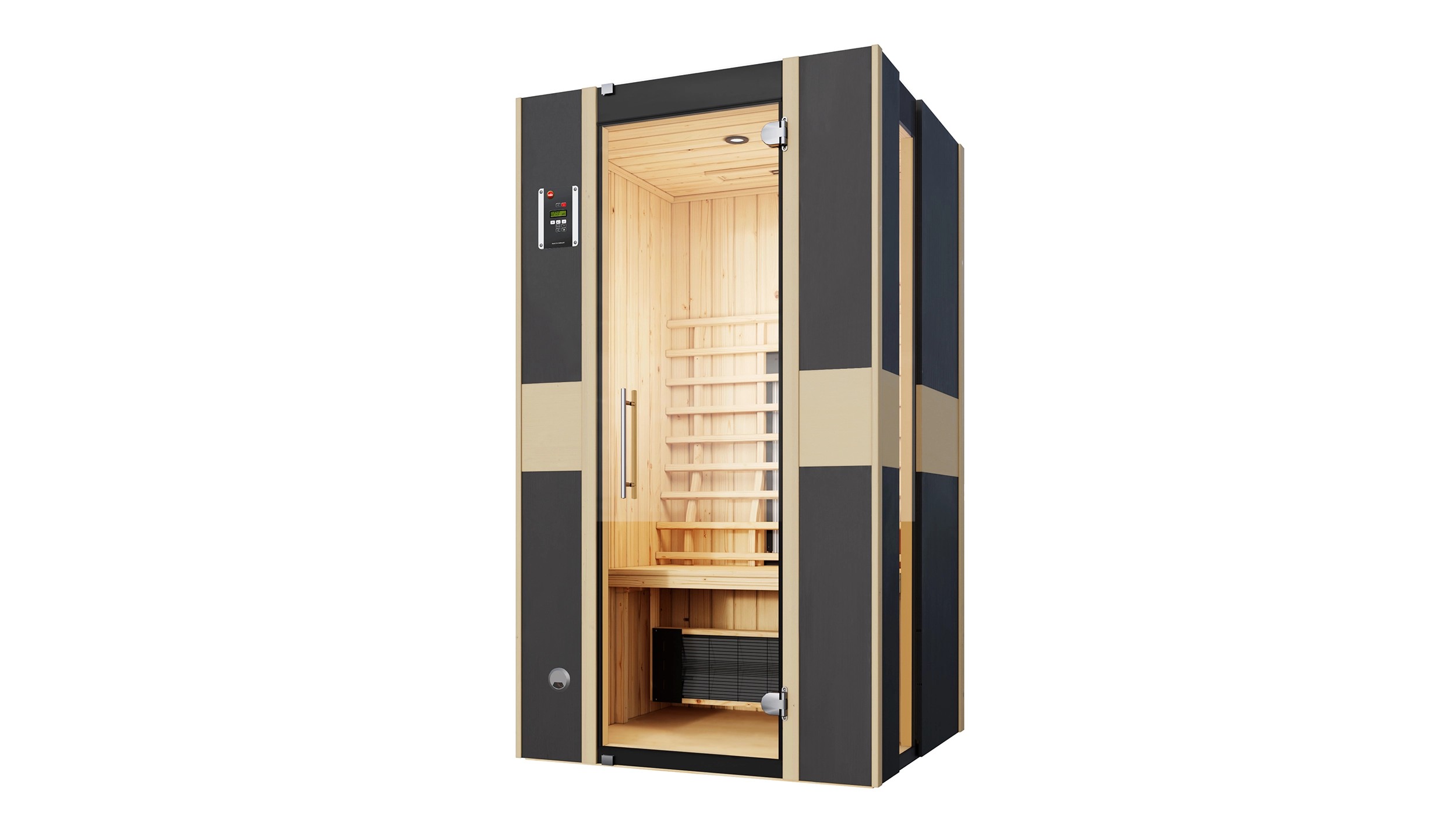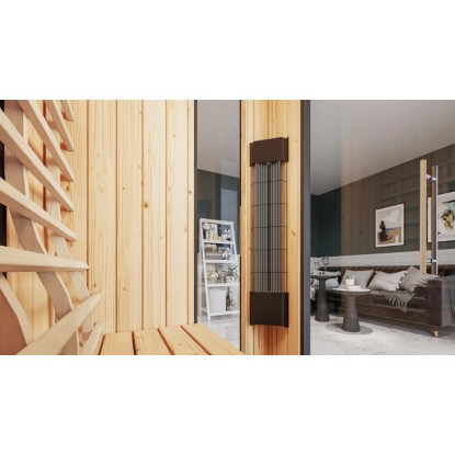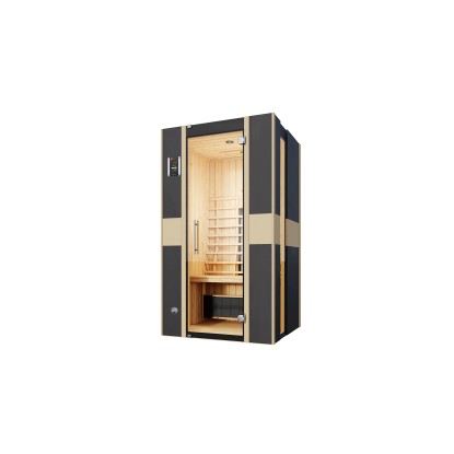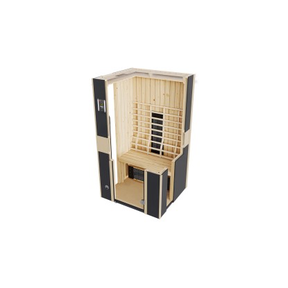Infračervená kabina je po celém obvodu vybavena jemnými keramickými zářiči, které se vyznačují velmi dobrou snášenlivostí. Prefabrikované prvky zajišťují rychlou a snadnou montáž infračervené kabiny. Součástí dodávky je vhodná podlaha, digitální řídicí jednotka a integrované halogenové bodové svítidlo, které zajistí potřebný komfort. Vnější strana infračervené kabiny má vzhled břidlice a je ozdobena zakončovacími lištami z lipového dřeva, což kabině propůjčuje velmi moderní vzhled. Kabina se dodává včetně velkých celoskleněných dveří a 2 okenních prvků v grafitovém vzhledu. Stabilní lavice s hloubkou 45 cm a vhodná zádová opěrka zajišťují útulnou atmosféru. Velikost a poloha sedadel infračervené kabiny je optimálně přizpůsobena seřízení a výkonu infračervených zářičů a zajišťuje dokonalé rozložení tepla v kabině.