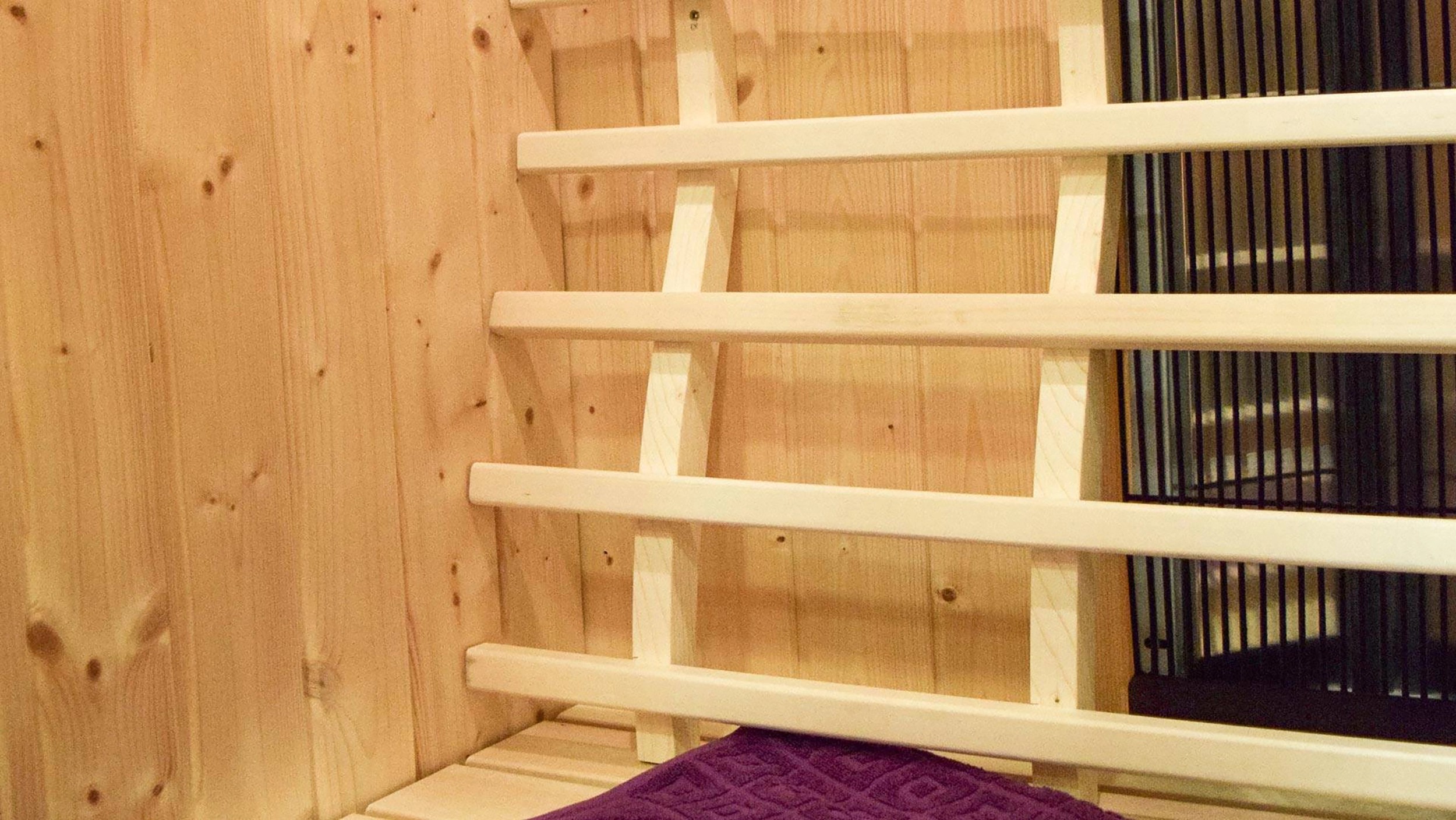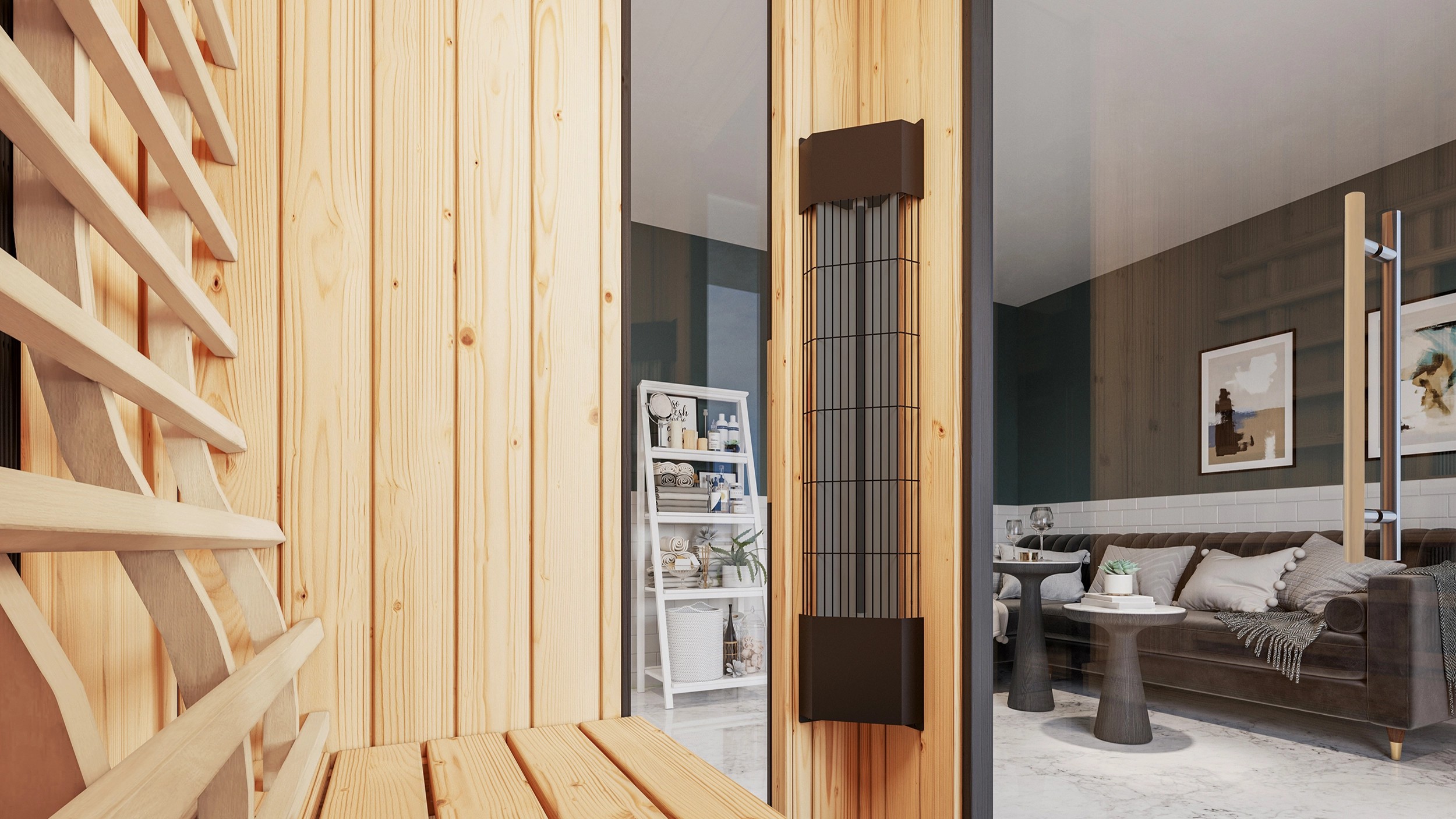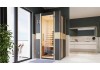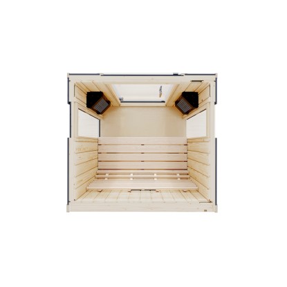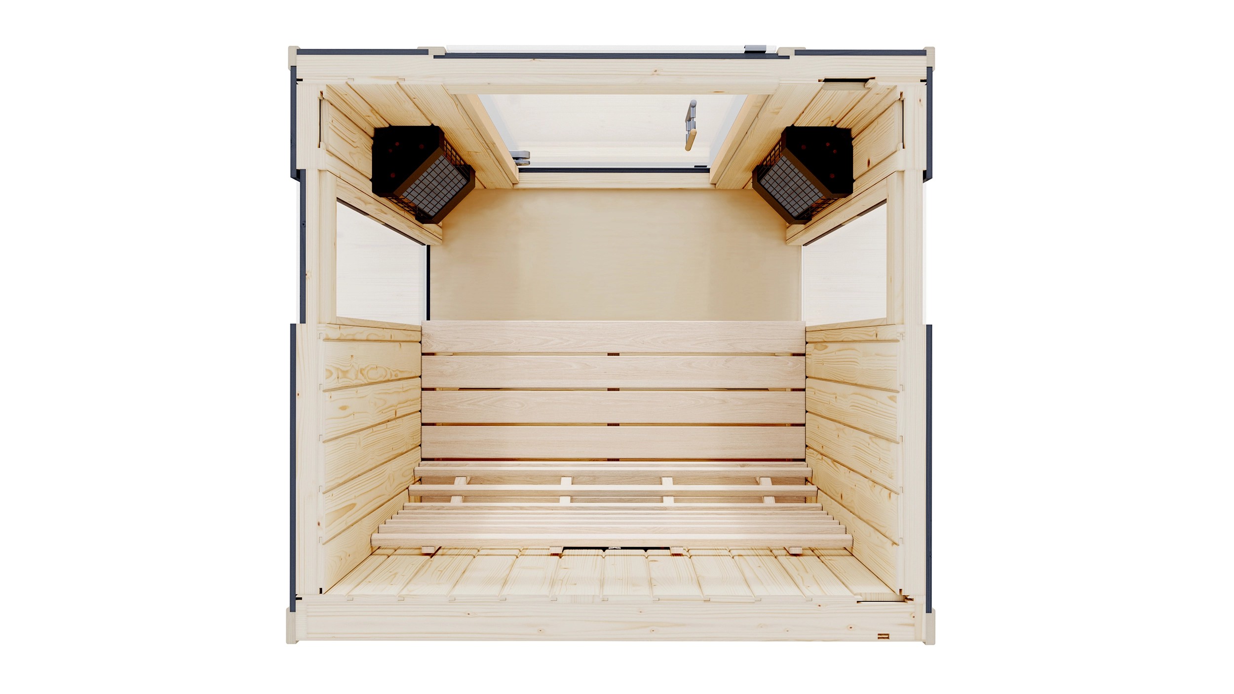 Infračervená kabina je po celém obvodu vybavena jemnými keramickými zářiči, které se vyznačují velmi dobrou snášenlivostí. Prefabrikované prvky zajišťují rychlou a snadnou montáž infračervené kabiny. Součástí dodávky je vhodná podlaha, digitální řídicí jednotka a integrované halogenové bodové svítidlo, které zajistí potřebný komfort. Vnější strana infračervené kabiny má vzhled břidlice a je ozdobena zakončovacími lištami z lipového dřeva, což kabině propůjčuje velmi moderní vzhled. Kabina se dodává včetně velkých celoskleněných dveří a 2 okenních prvků v grafitovém vzhledu. Stabilní lavice s hloubkou 45 cm a vhodná zádová opěrka zajišťují útulnou atmosféru. Velikost a poloha sedadel infračervené kabiny je optimálně přizpůsobena seřízení a výkonu infračervených zářičů a zajišťuje dokonalé rozložení tepla v kabině.