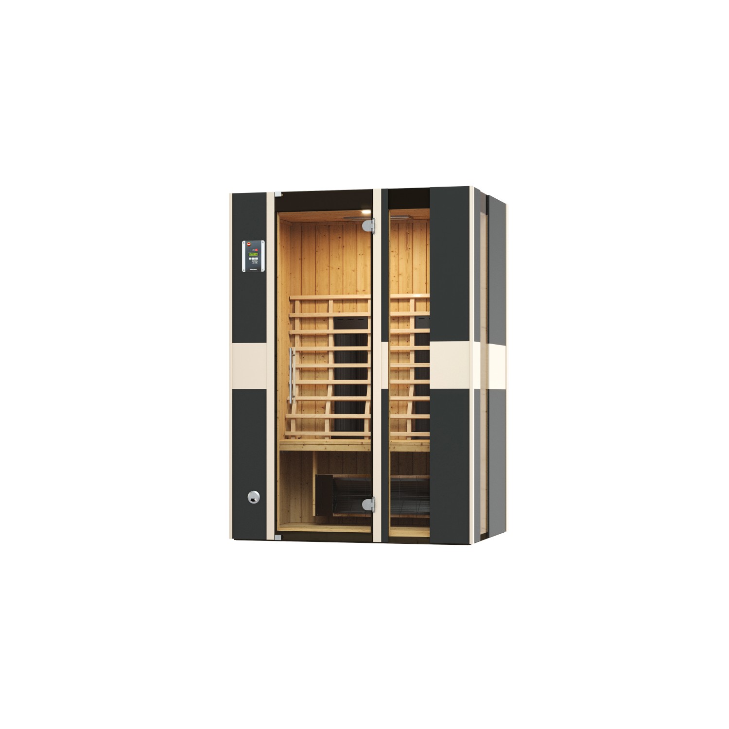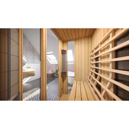 Infračervená kabina je po celém obvodu vybavena jemnými keramickými zářiči, které se vyznačují velmi dobrou snášenlivostí. Prefabrikované prvky zajišťují rychlou a snadnou montáž infračervené kabiny. Součástí dodávky je vhodná podlaha, digitální řídicí jednotka a integrované halogenové bodové svítidlo, které zajistí potřebný komfort. Vnější strana infračervené kabiny má vzhled břidlice a je ozdobena zakončovacími lištami z lipového dřeva, což kabině propůjčuje velmi moderní vzhled. Kabina se dodává včetně velkých celoskleněných dveří a 2 okenních prvků v grafitovém vzhledu. Stabilní lavice s hloubkou 45 cm a vhodná zádová opěrka zajišťují útulnou atmosféru. Velikost a poloha sedadel infračervené kabiny je optimálně přizpůsobena seřízení a výkonu infračervených zářičů a zajišťuje dokonalé rozložení tepla v kabině.