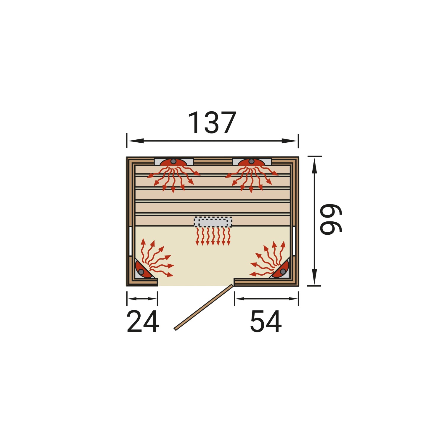 - 4 keramické zářiče: 2 rohové zářiče (à 500 W), 1 zádový zářič (350 W), 1 nožní zářič (350 W)