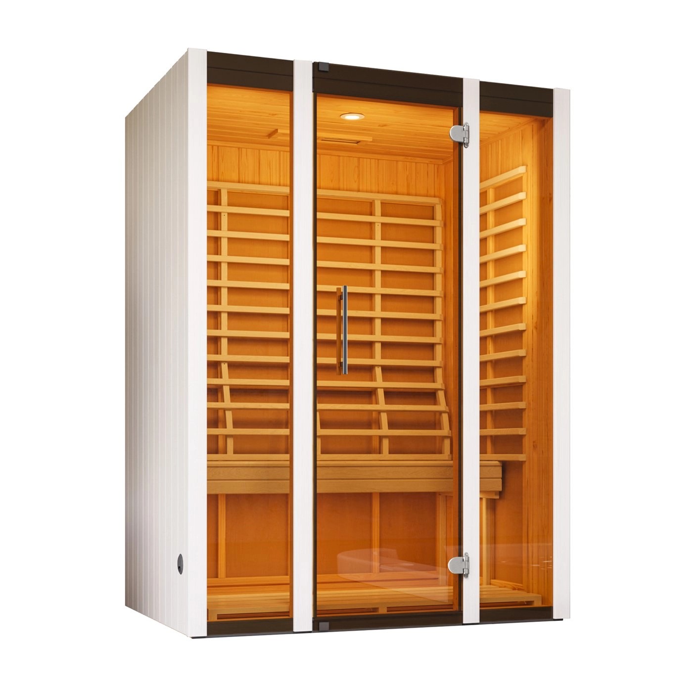 Infračervená sauna se díky bílému vzhledu ideálně začlení do vašeho domova. Na lavici o hloubce 55 cm se vejdou až dvě osoby. Halogenové bodové svítidlo na stropě zajišťuje příjemné osvětlení. Nasměrování a výkon plochých zářičů zajišťují rovnoměrné a homogenní vyzařování tepla ze všech stran. Pomocí multifunkčního ovládání snadno správně nastavíte teplo. Díky infračervenému záření se nemusí sauna dlouho předehřívat. Proto je obzvláště úsporná a ušetříte nejen energii, ale i čas.
