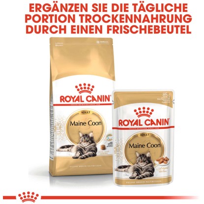 Aby mohlo uspokojit chutě co nejvíce koček, krmivo Royal Canin Maine Coon Adult je dostupné také jako suché krmivo s křupavými a chutnými granulemi. Pokud přemýšlíte nad kombinovaným krmením, jednoduše se řiďte našimi pokyny, aby vaše kočka dostávala to správné množství suchého i vlhkého krmiva.