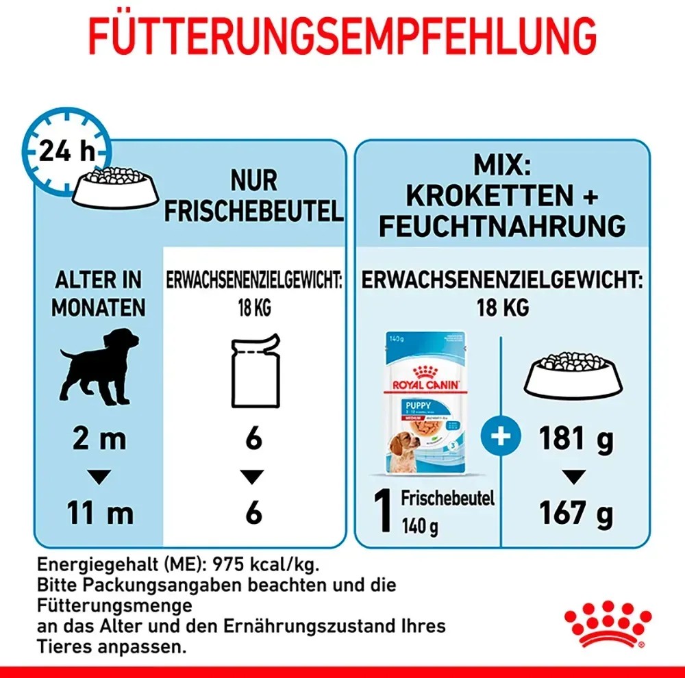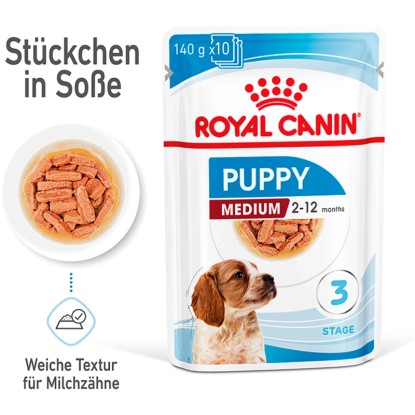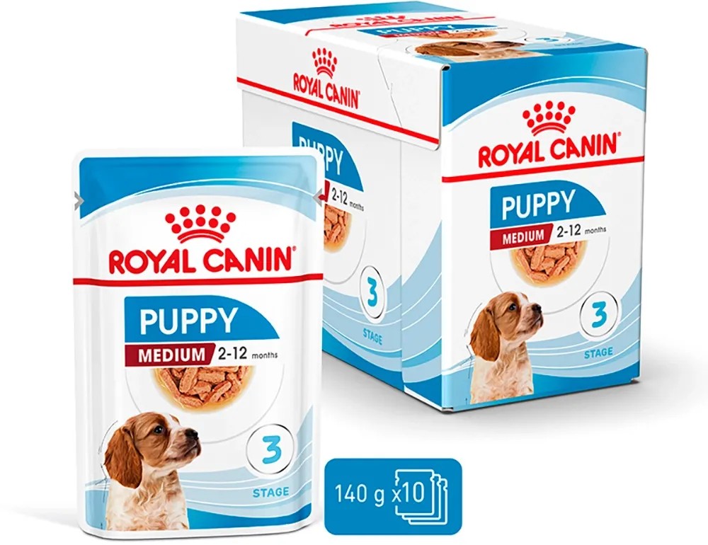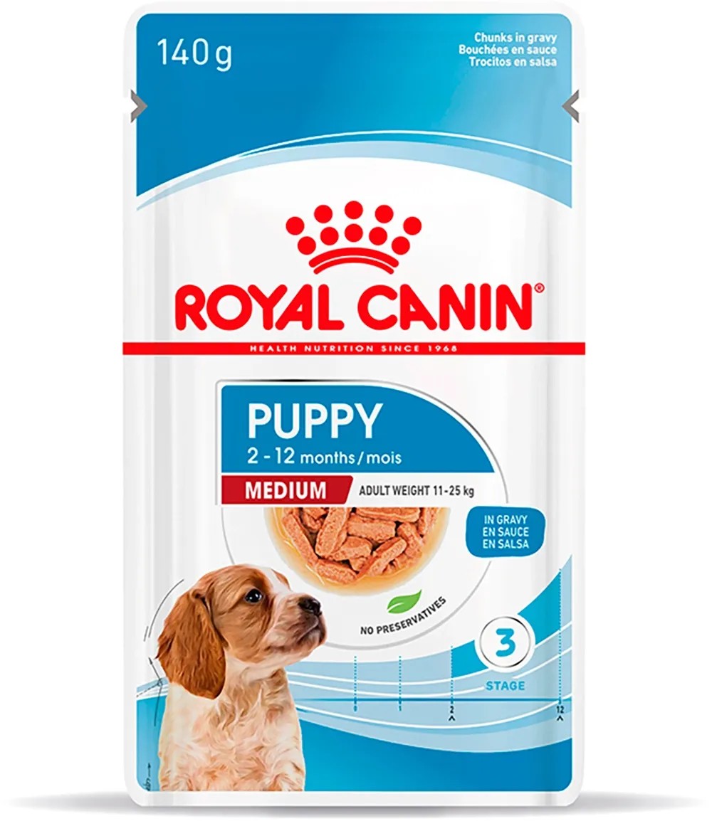 Krmivo Royal Canin Medium Puppy in Gravy je vytvořeno tak, aby uspokojovalo veškeré nutriční potřeby štěňat středních plemen do 12 měsíců, která budou mít v dospělosti váhu mezi 11 a 25 kg.