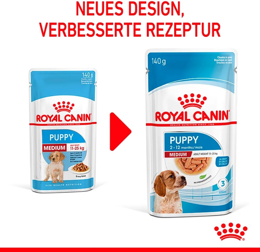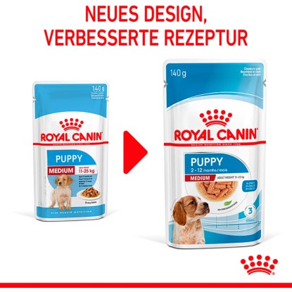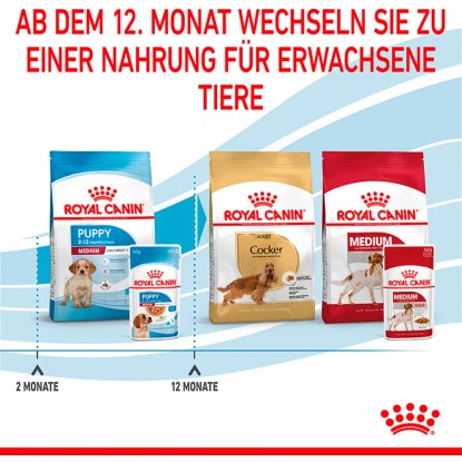 Růst je pro vaše štěně důležitým obdobím změn a objevů. Jeho přirozená obranyschopnost se stále vyvíjí. Protože vaše štěně roste, kompletní a vyvážená strava je nezbytná pro jeho optimální zdraví. Složení krmiva Royal Canin Medium Puppy in Gravy je vytvořeno tak, aby uspokojovalo veškeré nutriční potřeby štěňat středních plemen do 12 měsíců, která budou mít v dospělosti váhu mezi 11 a 25 kg.