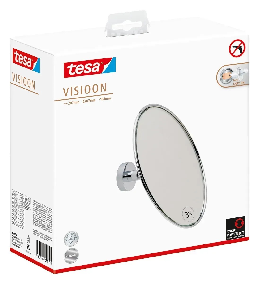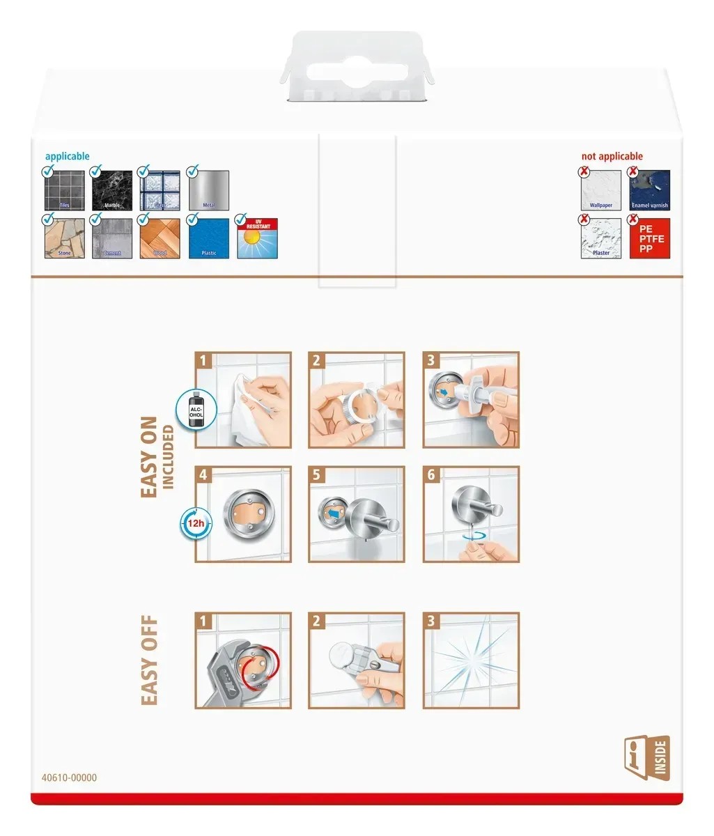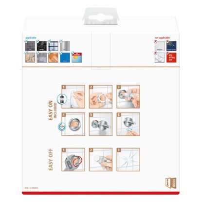 Ani montáž nemůže být jednodušší. Díky technologii tesa Power.Kit není nutné vrtat do obkladů. Upevnění pomocí lepidla bude hračkou i pro nezkušené a navíc je extrémně čisté. Lepidlo je odolné a spolehlivé, ale lze jej také bez zanechání zbytků v případě potřeby odstranit, což je důležitý aspekt, zejména v nájemních bytech. Pokud chcete zrcátko znovu připevnit, můžete to provést pomocí samostatně dostupného montážního adaptéru (BK20).