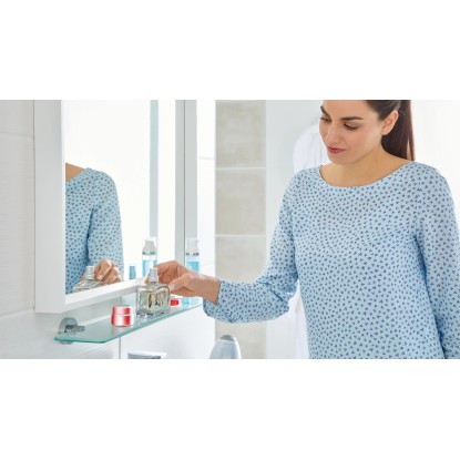 Zaoblená skleněná koupelnová polička tesa Smooz vyrobená ze saténového skla s lesklými chromovanými nástěnnými podložkami je elegantní součástí koupelnového stylu. Na široké obdélníkové poličce můžete mít bezpečně uloženy všechny toaletní potřeby. Hrany a rohy jsou zkosené, takže chrání vaše ruce.