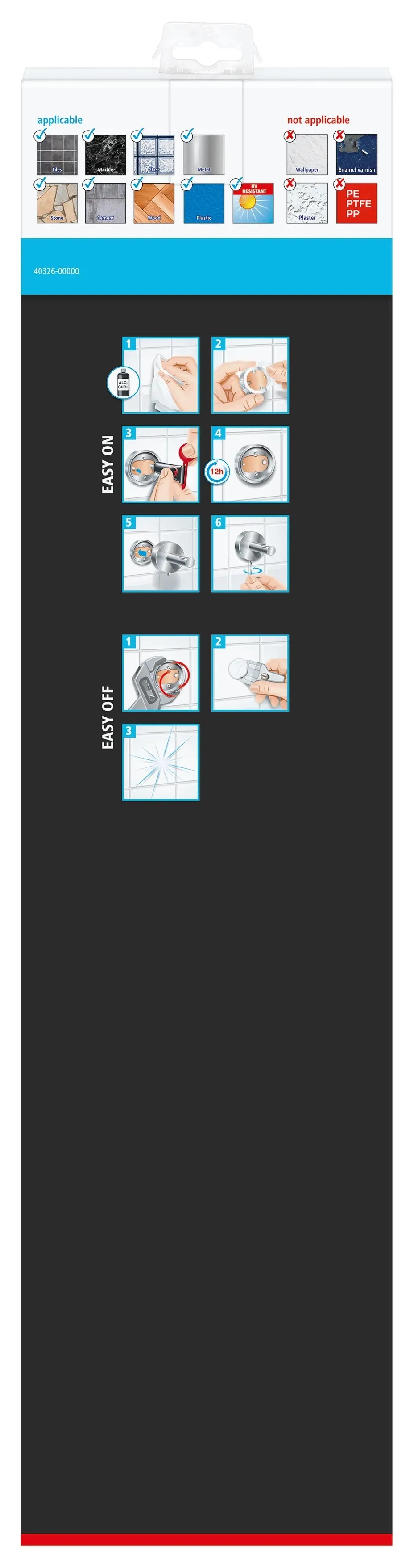 Skleněná polička se připevňuje lepením, které vyžaduje 12hodinové zaschnutí. Vrtání není nutné, nedochází k poškození povrchu. Připevnění je však stejně spolehlivé. Odstranění poličky je snadné a lze ho provést kdykoli a beze stopy. S adaptérem BK20-2 ji lze znovu snadno připevnit na jiném místě.