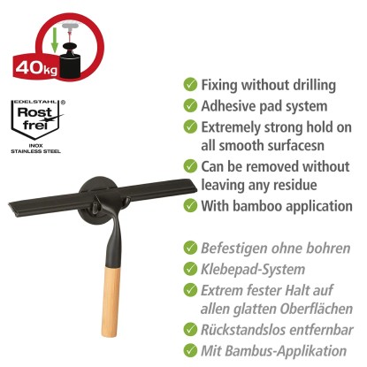 Díky koupelnové stěrce snadno zabráníte usazování vodního kamene. Stěrka je ideální i pro stírání jiných hladkých povrchů, jako jsou zrcadla a obklady v koupelně. Díky praktickému dvojitému gumovému okraji bude čištění obzvláště efektivní a snadné. Stěrka z nerezové oceli v matné černé v kombinaci s bambusem je dodávána spolu s držákem a náhradním okrajem.