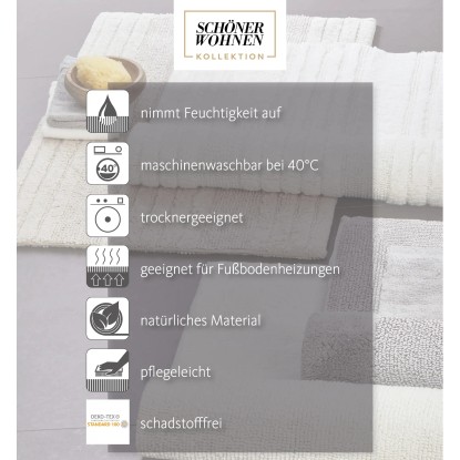 Wellness pro nohy - koupelnové předložky Bahamas z kolekce Schöner Wohnen promění každou koupelnu v oázu klidu. Hebké měkké bavlněné vlákno zajišťuje příjemně teplé nohy a navíc udržuje podlahu suchou. Oboustranně použitelné koupelnové předložky se ideálně hodí ke sprše, vaně nebo umyvadlu. Jsou testovány na škodliviny a hodí se i pro podlahová topení, navíc je lze prát v pračce na 30 °C a následně dokonce usušit v sušičce. Ať už jsou jednobarevné nebo s nadčasovým designem, koupelnové předložky Bahamas v různých barvách a velikostech se hodí do každé koupelny.