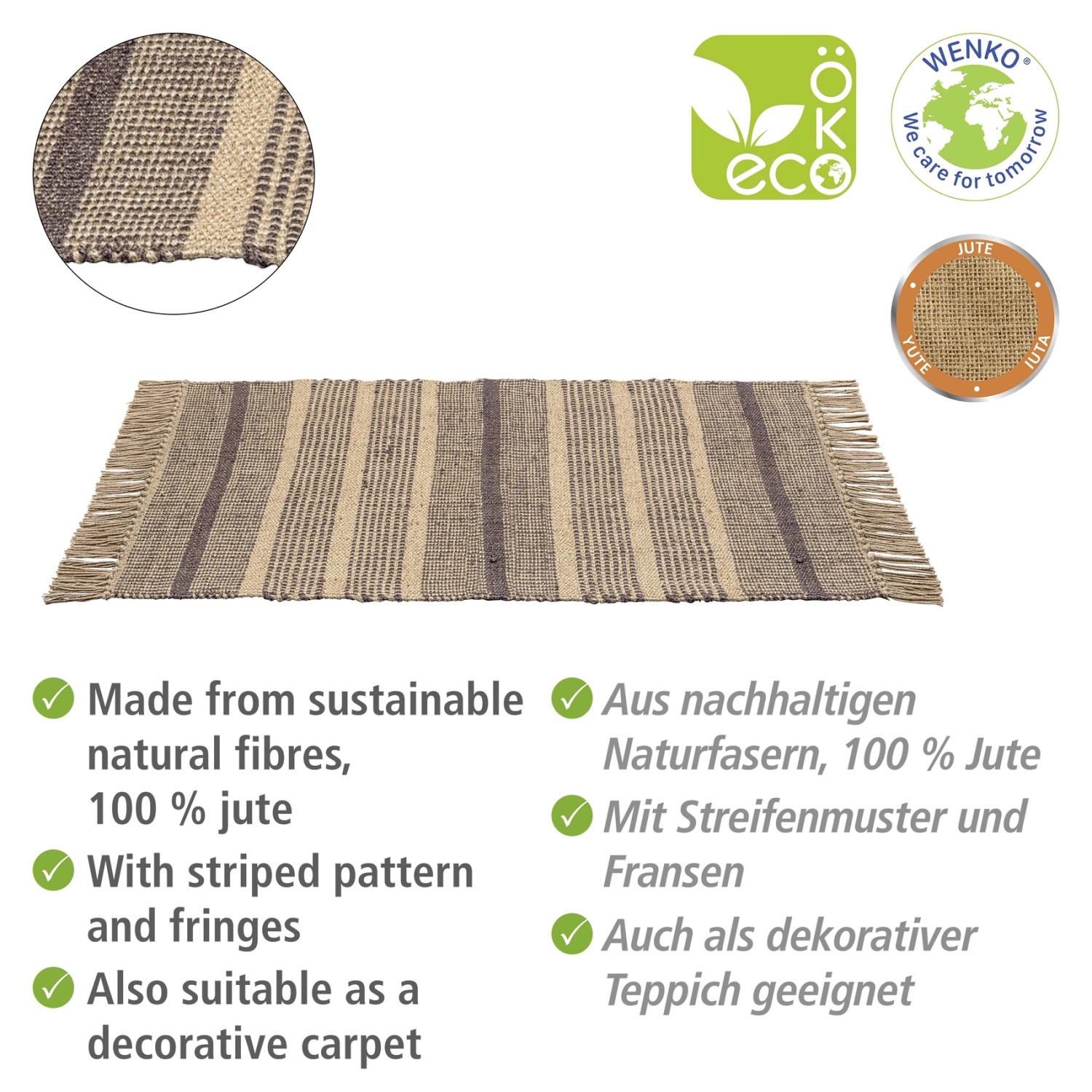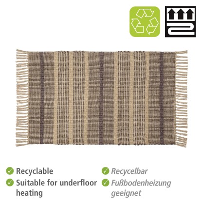 Koupelnová předložka Calama značky Wenko přinese do vašeho domova další malý kousek udržitelnosti. Je vyrobena ze 100% juty, a tedy z udržitelných přírodních vláken. Předložka je navíc recyklovatelná. Díky přírodním vláknům má každá jutový předložka jedinečný vzhled. Na kratších stranách je předložka doplněna třásněmi. Koupelnová předložka není opatřena protiskluzovou úpravou, doporučujeme protiskluzovou podložku pod koberec. Koupelnová předložka Calama je vhodná pro použití na podlahové topení.