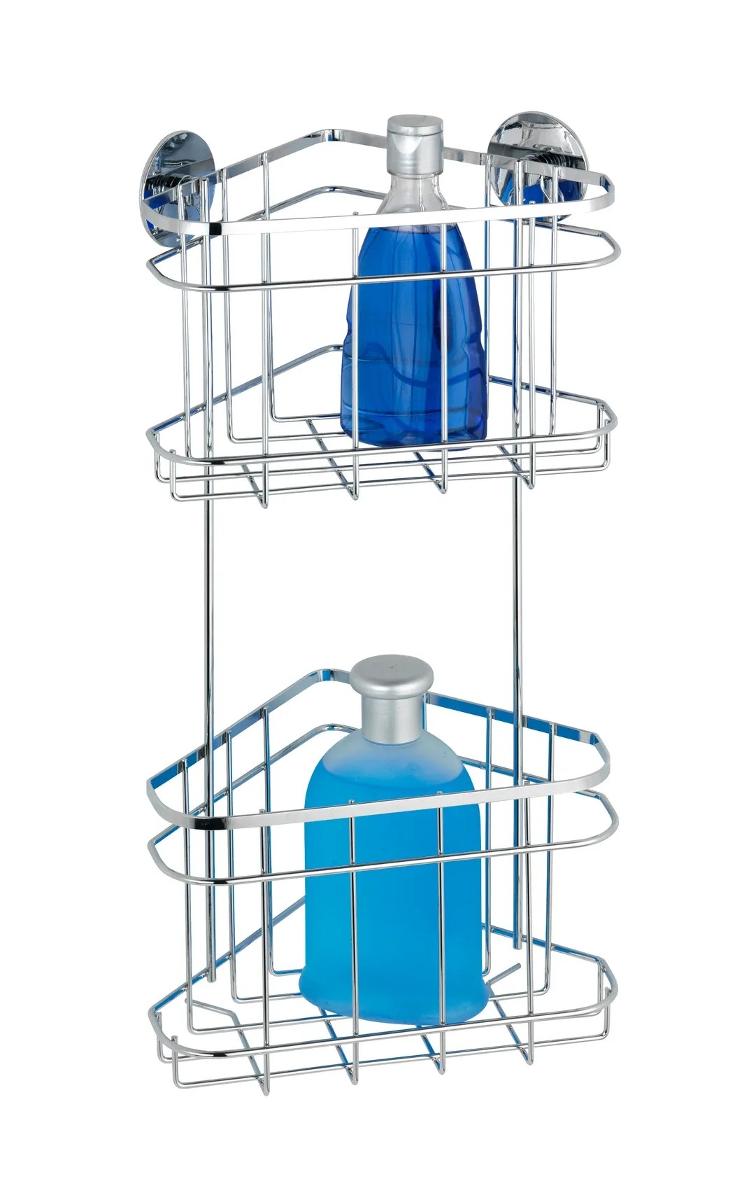Wenko Turbo-Loc rohový dvoupatrový regál z kvalitní nerezové oceli, zajišťuje stabilitu Vašich hygienických potřeb, díky vysokým košíkům. Vhodný, jak do sprchy, tak do celé koupelny.