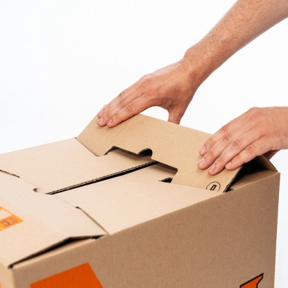 Kartonová krabice je vyrobena z vlnité lepenky, což umožňuje komfortní přepravu jakýchkoli předmětů. Krabice snadno přenesete pomocí vyražených úchytů. Díky stručným a přesným pokynům krabice sestavíte během několika minut. Jsou navíc vyrobeny ze 100% obnovitelných surovin a kompletně recyklovatelné.