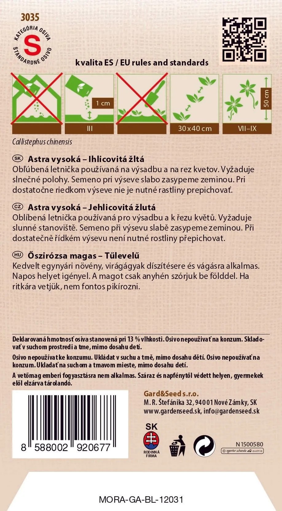 Astra vysoká jehlicovitá je nádherná okrasná jednoletá rostlina, dosahující výšky kolem 50-70 cm. Květy jsou jasně žluté. Rostlina je vhodná pro řez a dlouho si udržuje svůj pěkný vzhled ve váze. Astry patří k nejoblíbenějším letničkám na záhonech, vyhovuje jí slunné i polostinné stanoviště. Semeno slabě zasypeme zeminou. Při dostatečně řídkém výsevu není nutné rostliny propichovat.