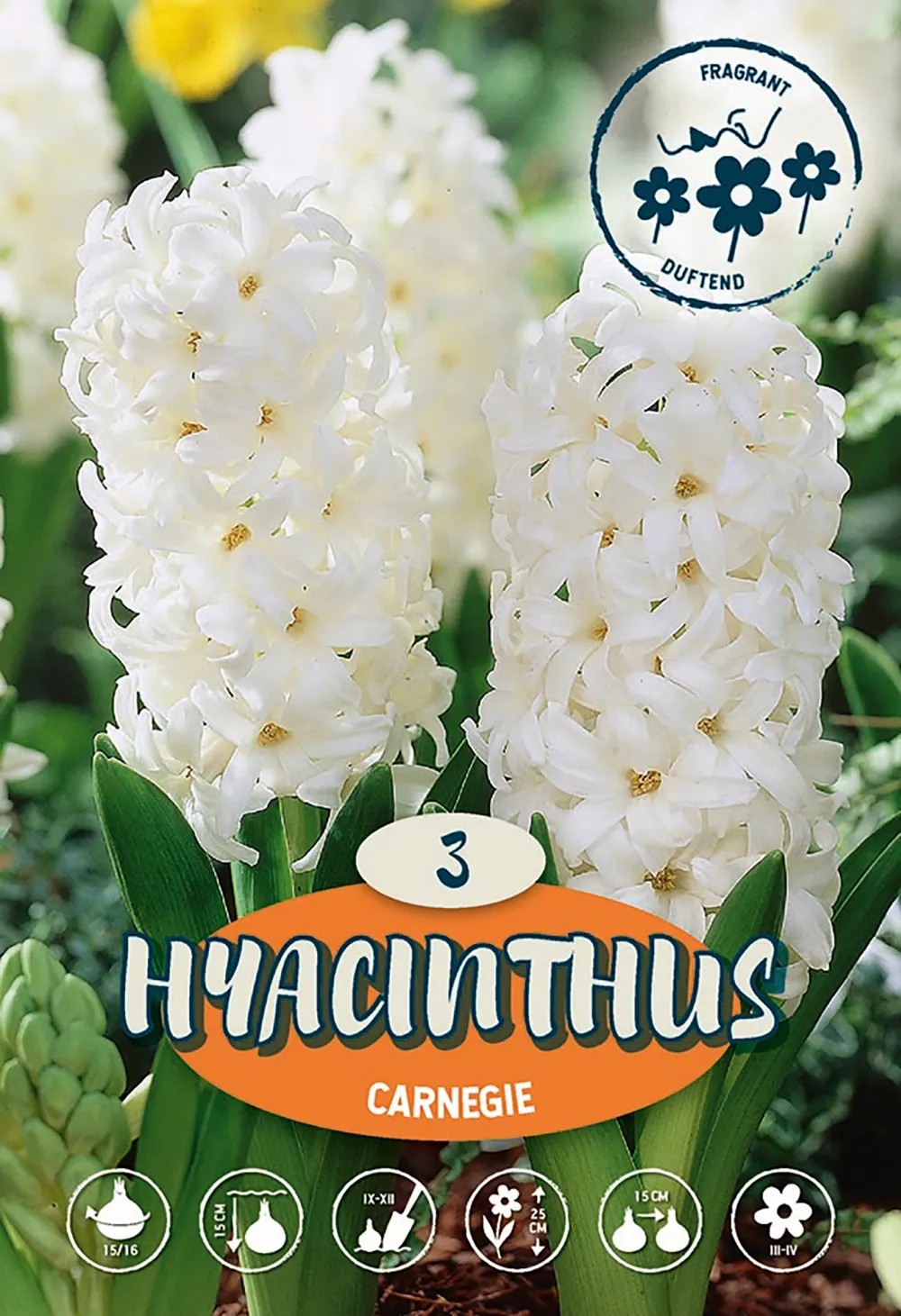 Hyacint Carnegie kvete na jaře, na podzim se vysazuje do cca 10 cm hluboké jamky. Půda by měla být dobře propustná pro vodu, tak jako u všech cibulovin. Tato květina je ideální do květinových záhonů nebo k ohraničení záhonů a dá se velmi dobře kombinovat s narcisy. Do zahrady přináší krásnou vůni.