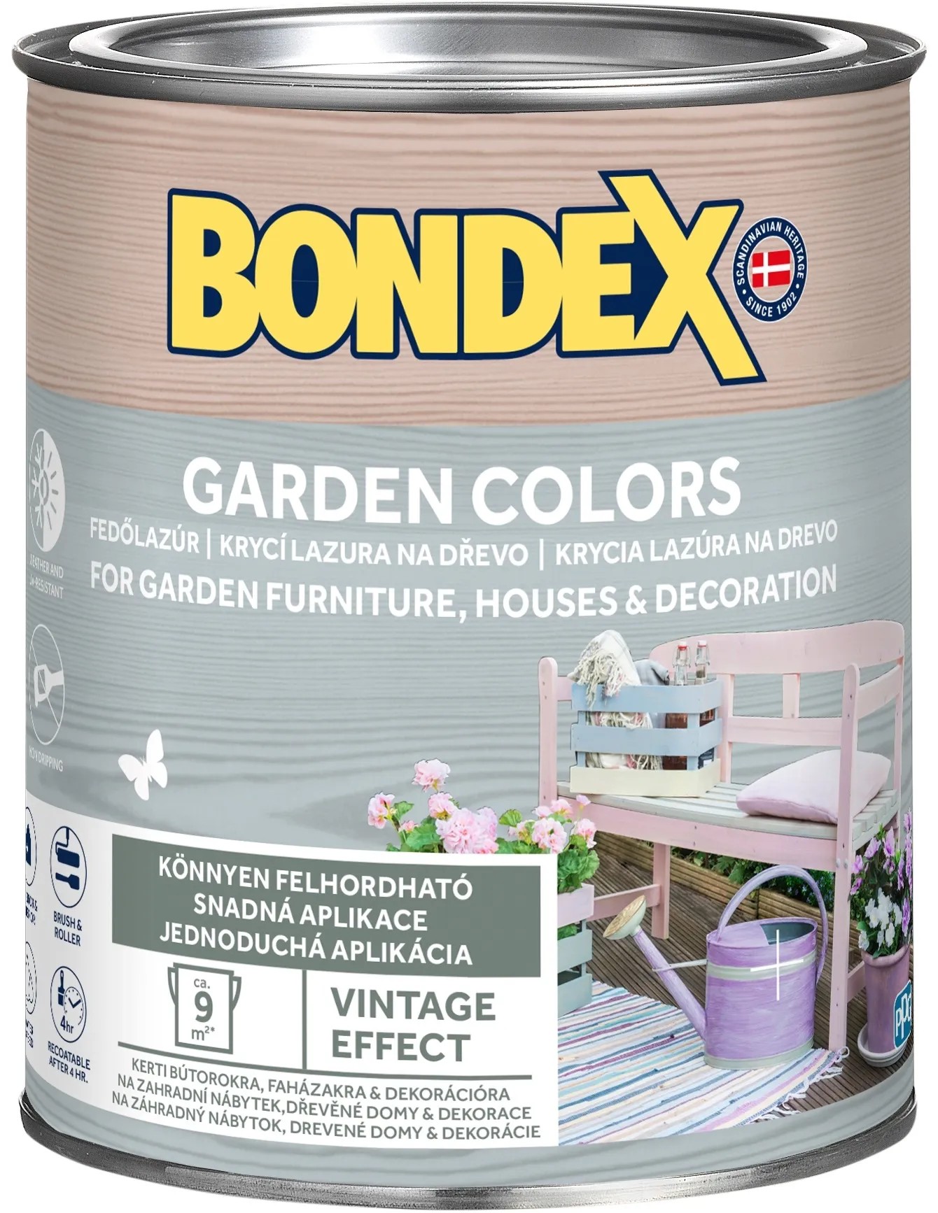 BONDEX GARDED COLORS je dekorativní krycí lazura na dřevo na vodní bázi, do interiéru i exteriéru. Vhodná pro ošetření dřeva, kovu, malých betonových a cihlových povrchů pro dekorativní účely. Při aplikaci na dřevěný povrch zanechává kresbu dřeva a chrání jej před škodlivými vlivy počasí a UV zářením. Díky gelové konzistenci se snadno nanáší a nestéká. Ideální na zahradní nábytek, dřevěné domky a dekorace.