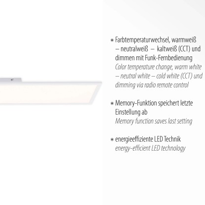 Ať už do domácnosti nebo do kanceláře tento LED stropní panel JUST LIGHT. FLAT je díky svému jednoduchému designu vhodný pro širokou škálu aplikací. Toto svítidlo FLAT má nastavitelnou teplotu chromatičnosti 2700-5000 K, od teplé bílé až po studenou bílou, je stmívatelné s funkcí paměti, která uloží poslední použité nastavení a disponuje funkcí nočního světla a časovače. Svítidlo je ovladatelné pomocí dálkového ovladače, který je součástí balení a je dodáván včetně 2 x 1,5 V AAA baterií.