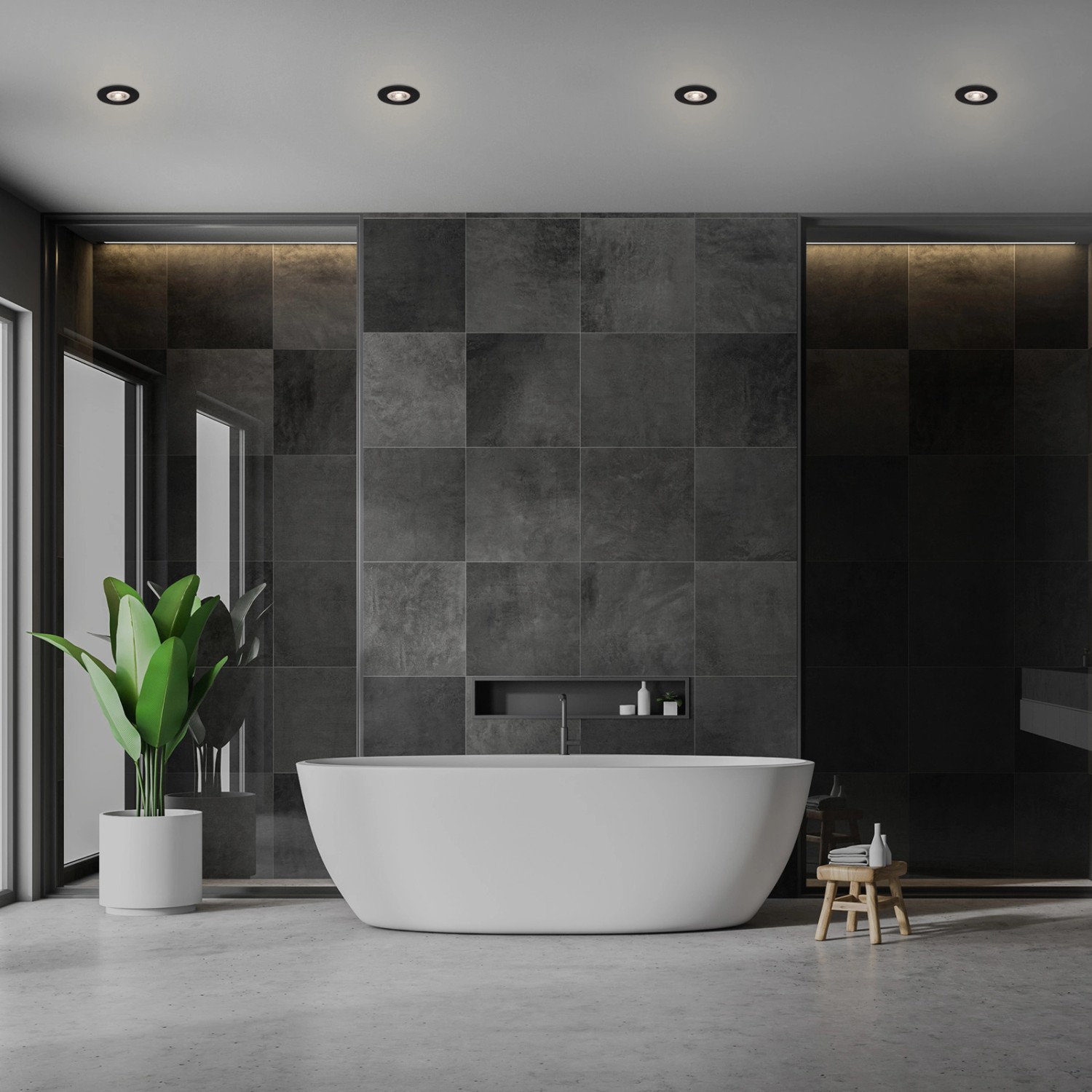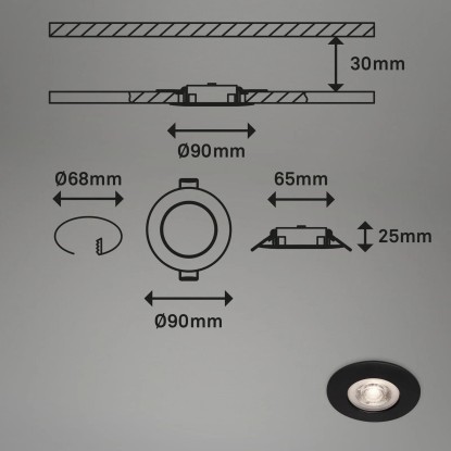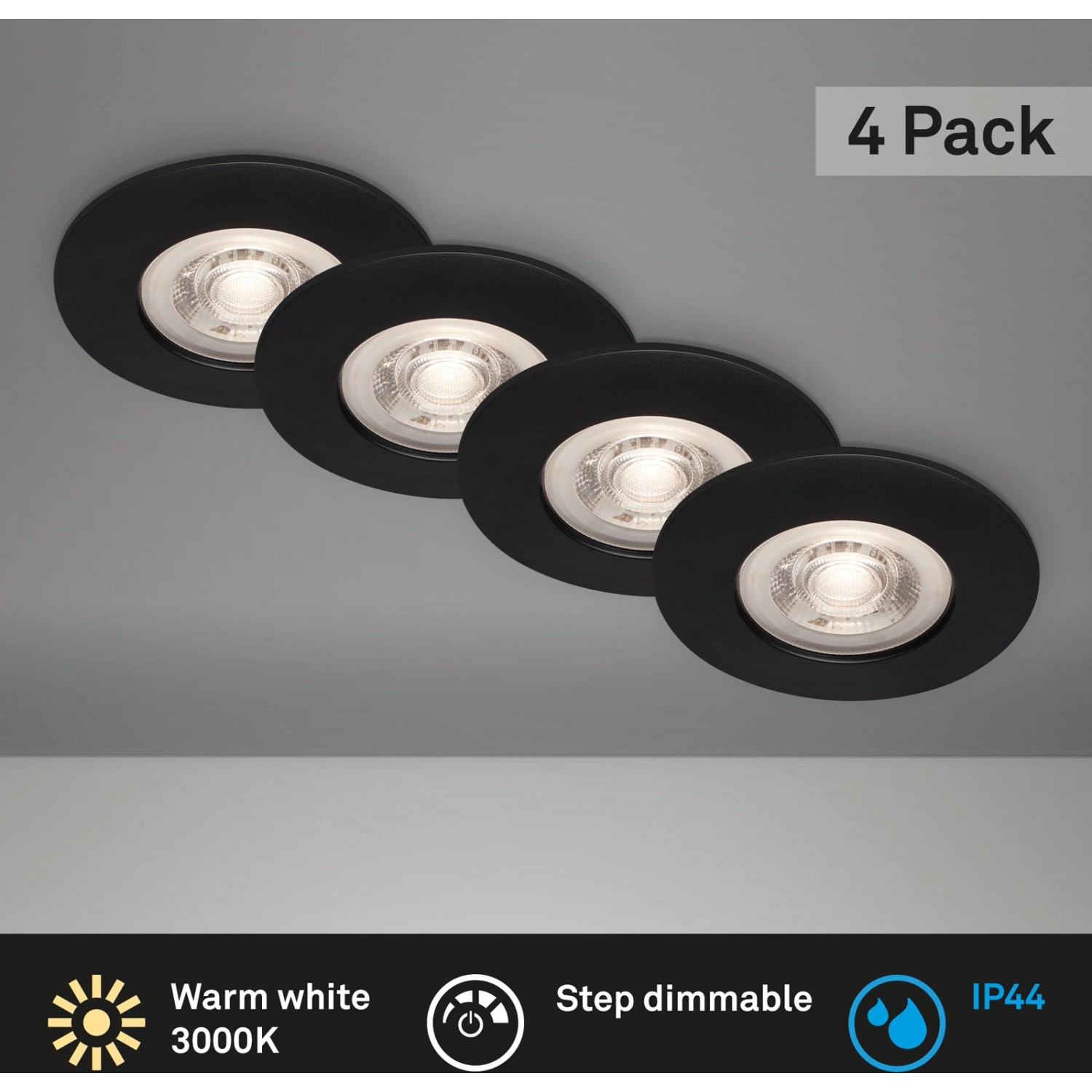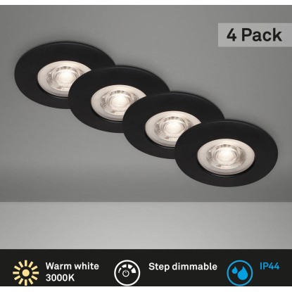 Brilo vestavné bodové stmívatelné LED svítidlo černé barvy ze série Kulana má pevně zabudovaný LED panel s výkonem 4,9 W a světelným tokem 480 lumenů. Svítidlo má teplou bílou barvu světla (3000 K) a jeho jas lze postupně regulovat pomocí běžného nástěnného spínače. Díky stupni krytí IP44 je chráněno proti stříkající vodě, a proto se hodí i do koupelny. Vestavné svítidlo se dodává v praktické sadě čtyř kusů. Montážní rozměr má průměr 6,8 cm a montážní výšku 3 cm. Svítidlo má rozměry 9 x 2,5 cm (pr. x V).