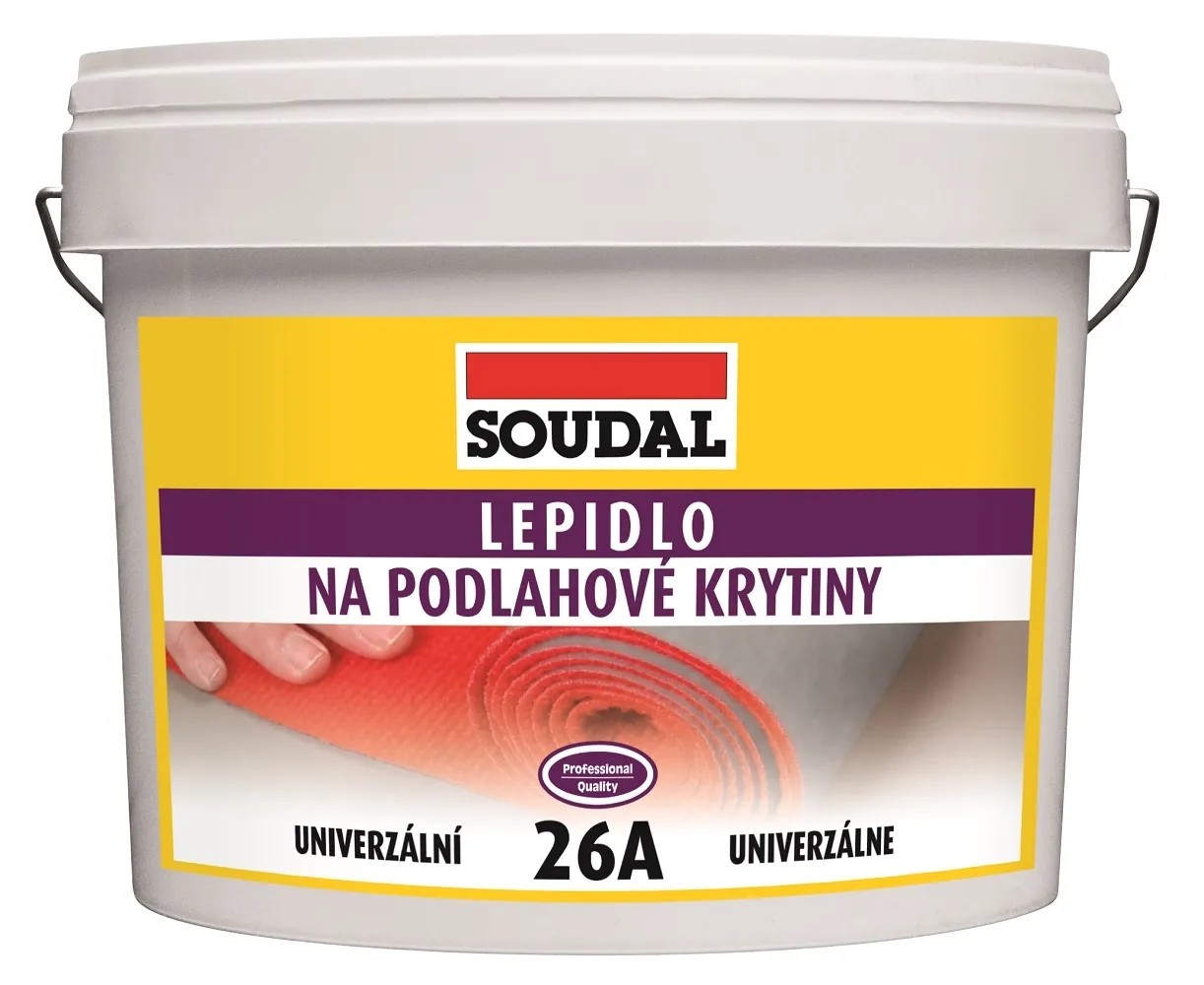 Soudal lepidlo na podlahové krytiny 26A univerzální lepidlo pro lepení všech druhů podlahových krytin připravené k okamžitému použití. Snadno se nanáší, silná přilnavost, dlouhý otevřený čas, elastické, profesionální kvalita. Lepení všech typů podlahových krytin. Fixace koberců s i bez pěnového podkladu, linoleí, podlahových krytin s vinylovým nebo PVC podkladem, vodotěsných krytin s PVC podkladem. Univerzální lepidlo na bázi vodní disperze syntetických pryskyřic s dlouhou dobou zpracovatelnosti a vysokou smykovou pevností spoje. Neobsahuje rozpouštědla.