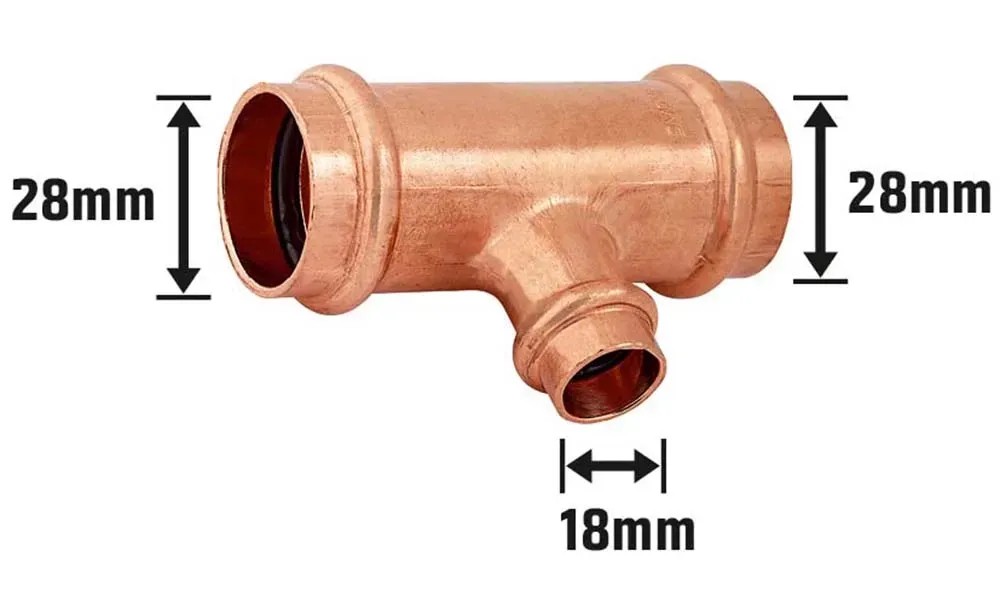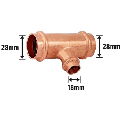 Lisovací redukční T-kus se používá k vzájemnému propojení více trubek s různými průměry. Je vhodný pro měděné trubky a sám je také měděný. Má tvar písmene T a umožňuje rozvětvení nebo napojení dvou potrubí. Obě odbočky T-kusu mají průměr 28 mm, zatímco přípojka měří 18 mm. Montáž probíhá stlačením pomocí lisovacích kleští. T-kus má certifikaci DVGW a má povolení k použití na instalaci pitné vody.