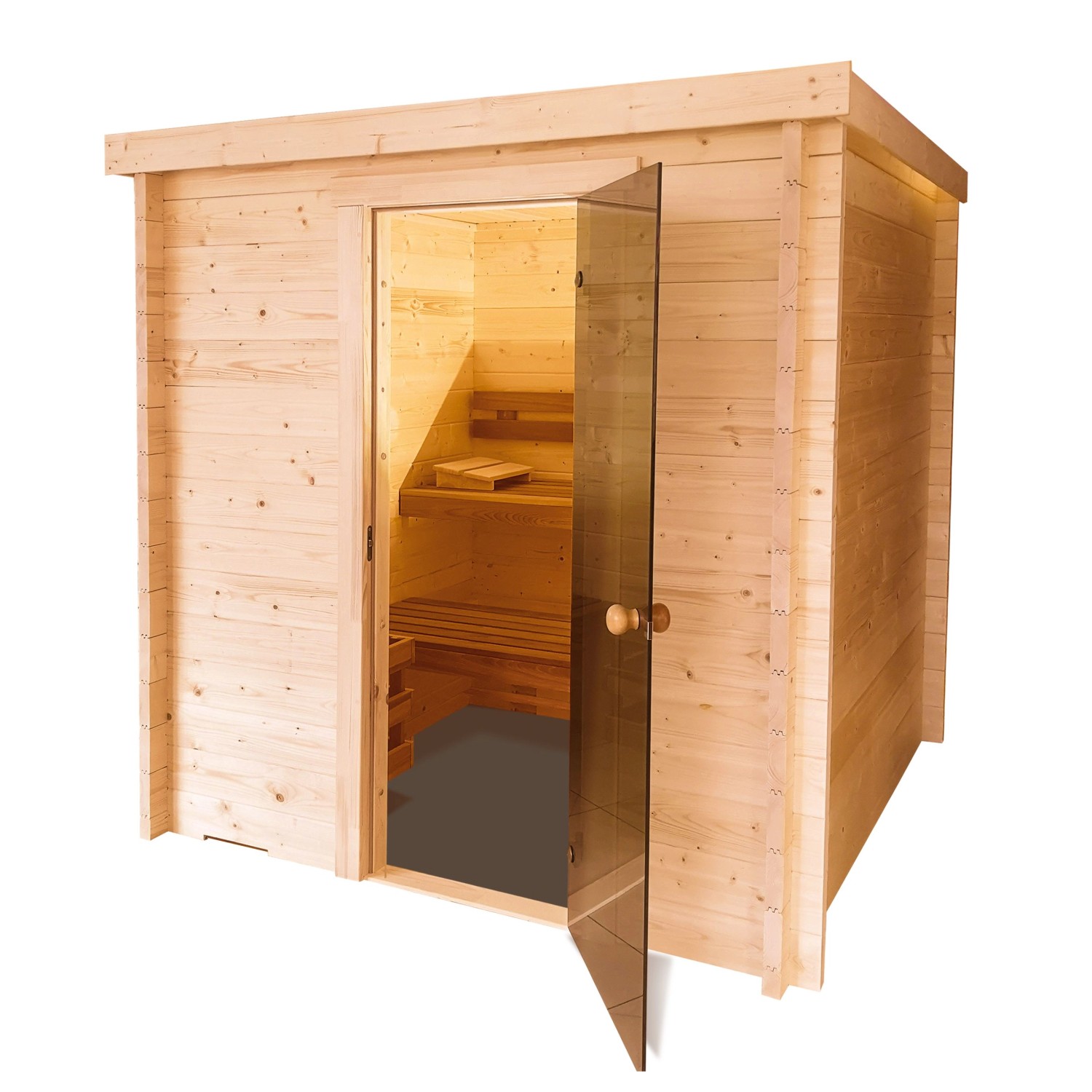 Jednoduchá sauna srubové konstrukce je vyrobená z kvalitního severského smrku tloušťky 40 mm. Svislé propojení dvojitou perodrážkou se závitovými tyčemi. Střecha sauny je panelová, rám je s izolací 40 mm a hliníkovou fólií. Z vnitřní strany střechy je obklad z výběrového severského smrku tloušťky 14 mm, shora lisovaná dřevovláknitá deska. Lehátka, opěrky zad a kryt saunových kamen jsou vyrobeny z výběrové severské thermo osiky, opěrka hlavy z výběrové osiky. Dveře jsou prosklené, bezpečnostní, tvrzené, tloušťky 8 mm bronz. Součástí každých dveří je těsnění, madlo a válečkový uzávěr dveří.