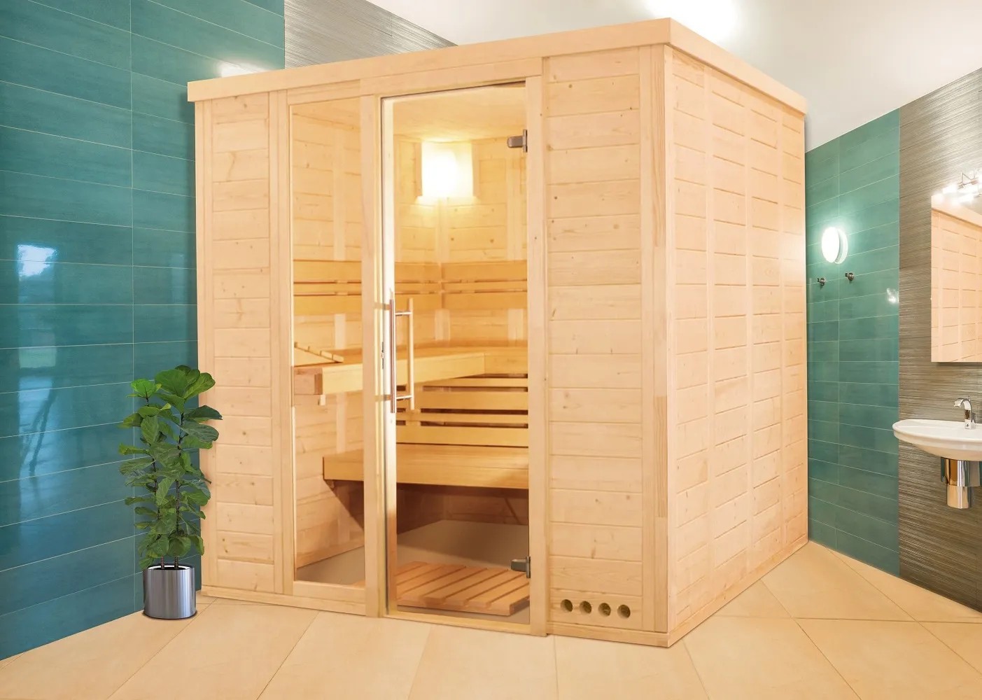 Sauna je panelové konstrukce. Stěnové a střešní panely jsou vyrobeny z výběrového severského smrku tloušťky 40 mm, což zajišťuje dostatečné tepelněizolační vlastnosti a rychlý ohřev při použití vhodné saunové pece. Ve stěnách panelů jsou provrtány otvory pro rozvod elektrické instalace k peci a osvětlení. Dveře sauny jsou dodávány jako celek včetně zárubně, čiré sklo je bezpečnostní tloušťky 8 mm, orientace pravo/levá dle představy zákazníka. Osazení panelu je alternativní, vpravo nebo vlevo od dveří podle rozhodnutí zákazníka při montáži. Kontaktní plochy interiérových dílů /saunové lavice, opěrky zad, meziopěrky, opěrky hlavy, podlahový rošt a kryt kamen/ jsou ze světlého dřeva Abachi. Je to výběrový materiál bez suků a jiných vad dřeva s nízkou tepelnou vodivostí.