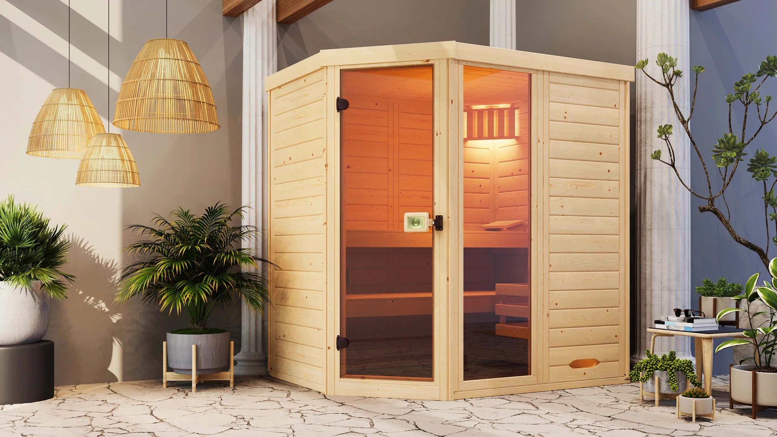 Weka modulární sauna z masivního dřeva Laukkala 2 včetně sady svítidel do sauny se ideálně hodí domácí saunování v příjemném teple.