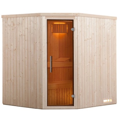 Weka masivní sauna Kiruna je ideální pro domácí saunování v příjemném teple. Díky inteligentnímu konceptu interiéru umožňuje saunování i bez silnoproudé přípojky - přitom stačí přípojka 230 V.