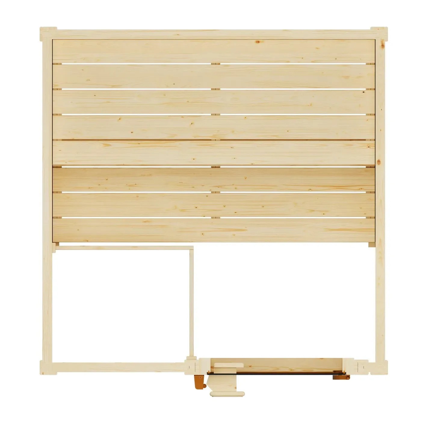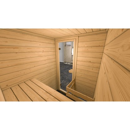 Sauna se skládá z dřevěných fošen o tloušťce 38 mm, které zajišťují příjemné klima a dlouhou životnost. Spojení dvojitých drážek a per zajišťuje nejvyšší možnou těsnost a tvarovou stabilitu.