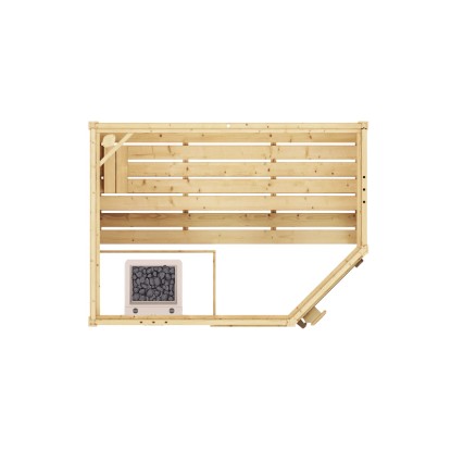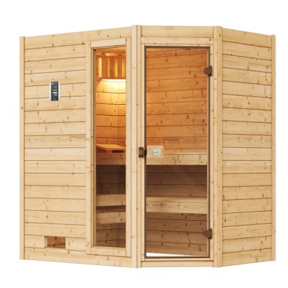 Masivní dřevěná sauna z fošen o tloušťce 38 mm pro optimální klima v sauně a dlouhou životnost. Fošny jsou opatřeny dvojitou drážkou a perem pro vysokou stabilitu a těsnost. Sauna je opatřena extravagantními celoskleněnými dveřmi z čirého bezpečnostního skla, které lze připevnit vpravo nebo vlevo. Přiložené 2bodové magnetické zavírání přitom zajišťuje bezproblémové otvírání a zavírání dveří sauny a propůjčuje jim kvalitní vzhled. Dobře koncipovaný vstup s nízkým prahem usnadňuje vstup a výstup. Součástí dodávky jsou dvě stabilní lehátka a 2 opěrky hlavy pro potřebný komfort. Díky praktickému rohovému vstupu je tato sauna optimální i do malých prostor.