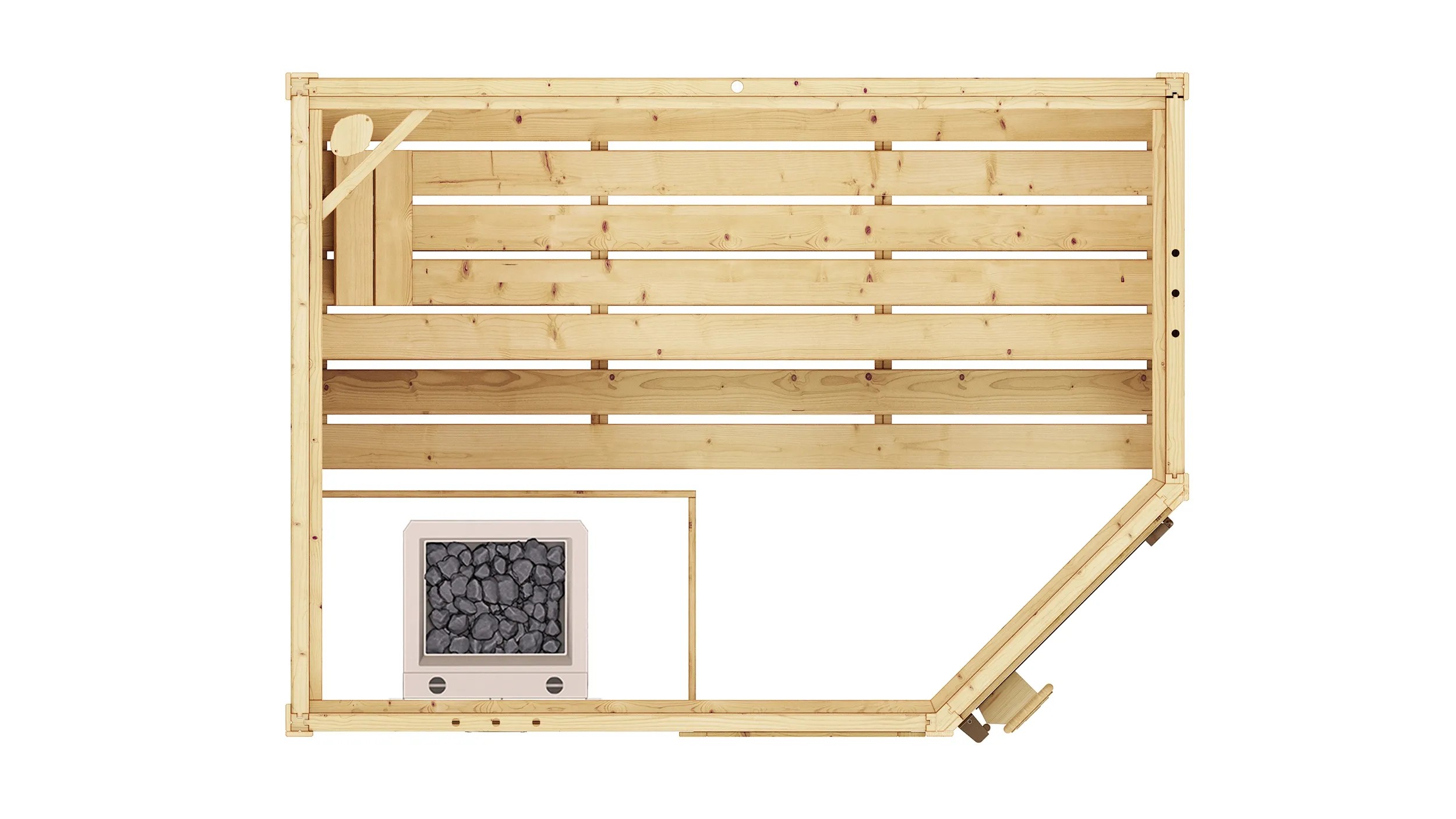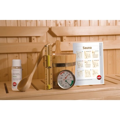 - Rohový vstup včetně 5dílné sady příslušenství skládající se z naběračky, měřiče klimatu, přesýpacích hodin, vědra a pravidel koupání v sauně