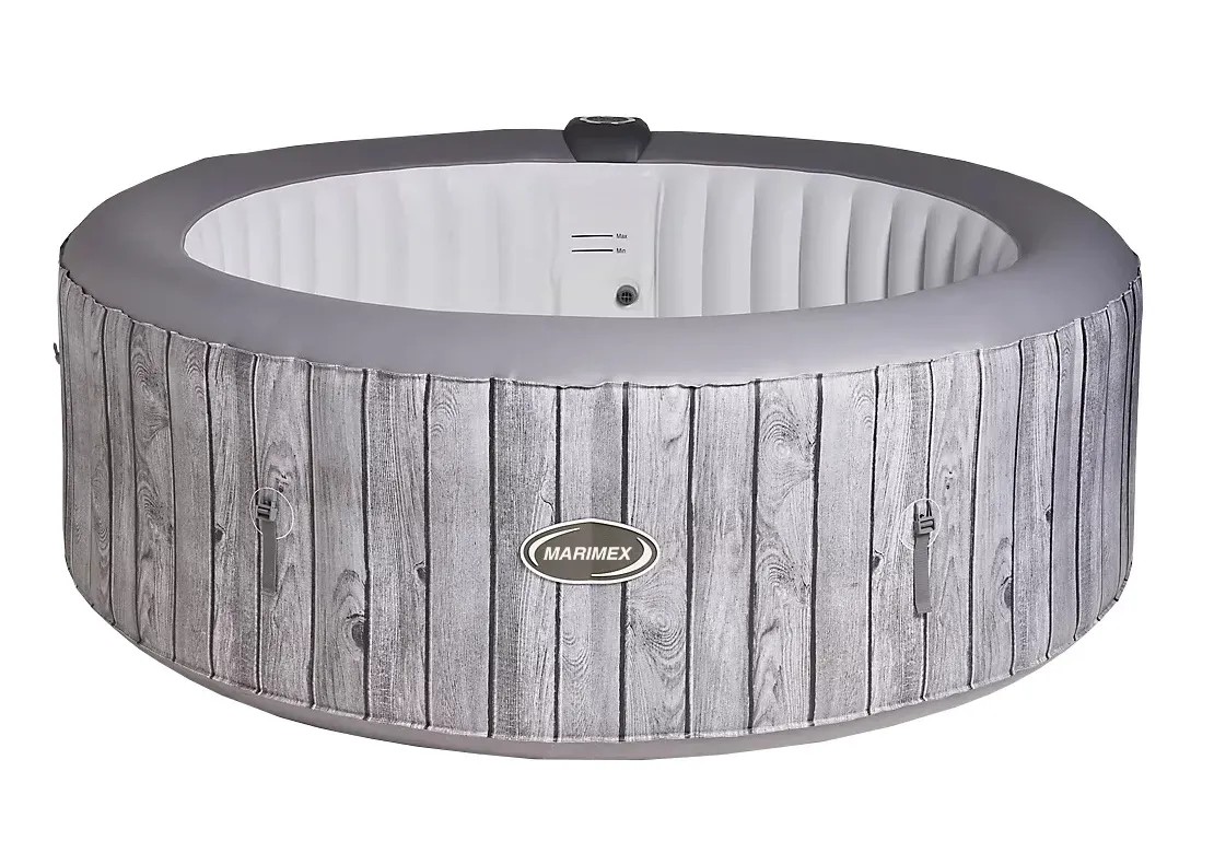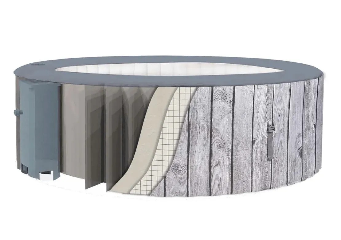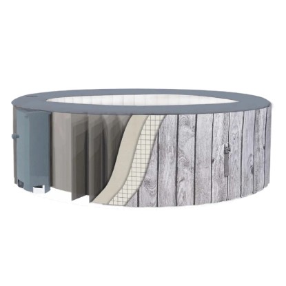 Tento kruhový vířivý bazén v designu šedého dřeva je vybaven 130 vzduchovými tryskami a pojme až 930 l vody. S vestavěným filtračním čerpadlem a ohřevem. Režim bublinek s bublinkovými tryskami. Bazén je dodáván včetně sady na opravu, podložky na zem a vrchního krytu.